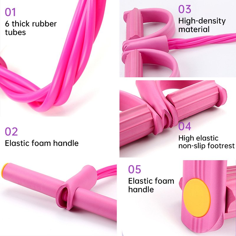 6-Tube Elastic Design: Features six individual elastic tubes for uniform force distribution and enhanced safety during use. Anti-Slip Pedals: Equipped with soft foot pedals made of high-density NBR foam cotton, providing comfort and superior anti-slip performance. Versatile Application: Suitable for general fitness training, body shaping, and toning exercises for the abdomen, waist, arms, etc.