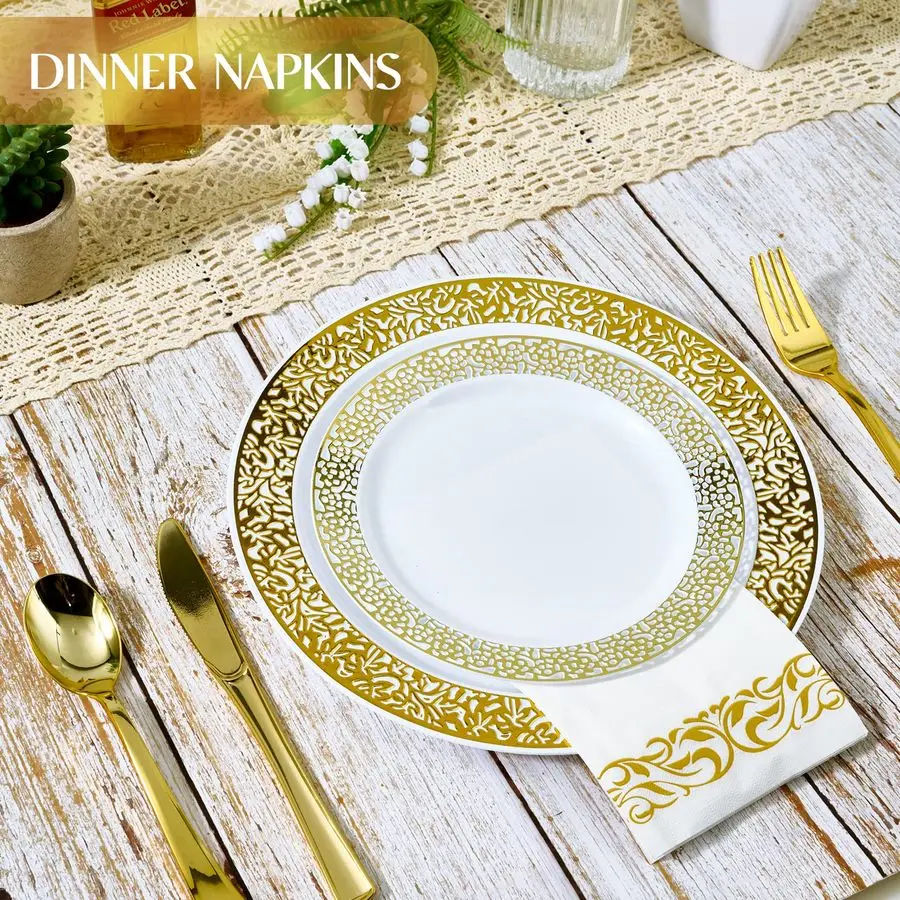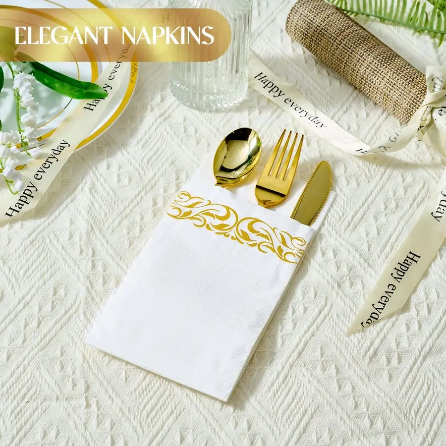 Elegant Design The white dinner napkins are printed with a delicate gold trim decorative design, which shows your fashion sense, Adding charm and elegance to your dining table, bedroom. providing guests premium comfort and luxury