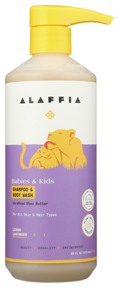 Alaffia’s nurturing lemon lavender shampoo & body wash, prepared with Ethically Traded unrefined shea butter, virgin coconut oil, calming lemon balm, protective neem leaf, and soothing lavender, nourishes and softens hair and skin. Gentle and non-irritating for EveryDay clean fun.