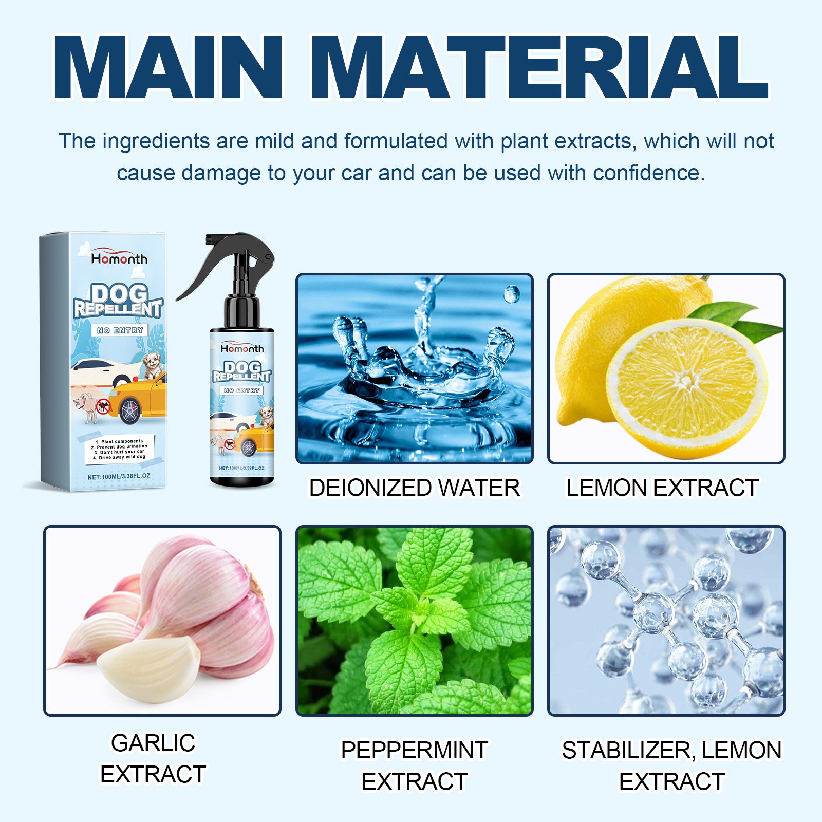 Our car tire safety dog repellent spray contains garlic juice, peppermint extract. It can effectively prevent dogs from urinating on your car tires and protect your tires from damage. Its application is simple: shake well before use, then spray into your pet’s mouth once a day. And it keeps the dog from peeing on the tires.