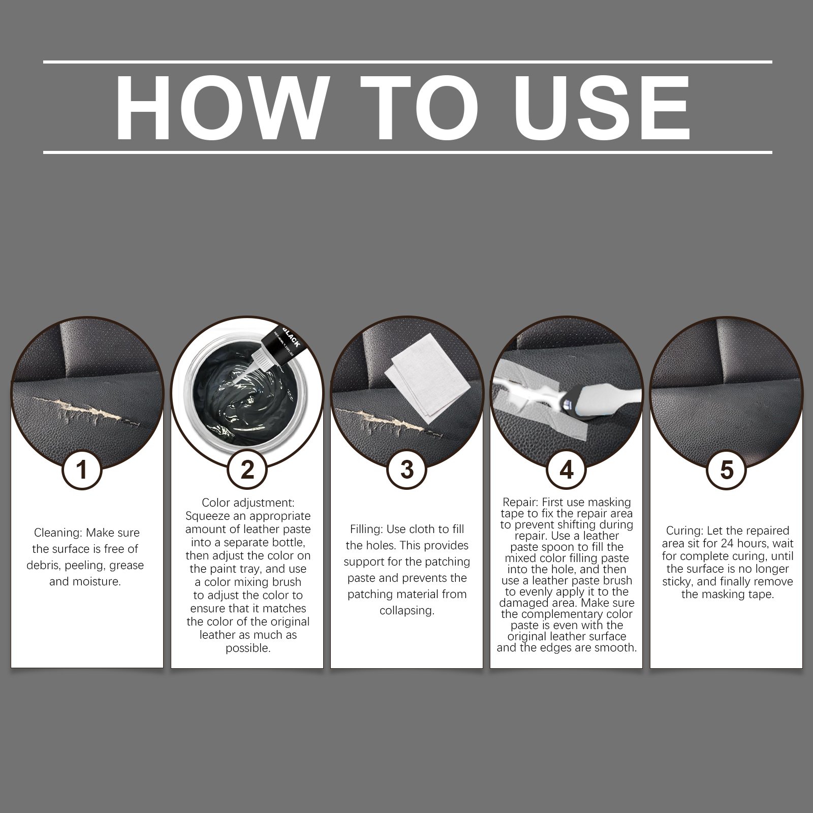 Our car leather seat repair kit contains silica, acrylic emulsion, adhesive. It can easily fill cracks and scratches on the leather seat and restore the original texture of the leather seat. Its use method is very simple: 1. Clean: ensure that the surface is free of debris and peeling. Grease and moisture. 2. Color mixing: Squeeze the appropriate amount of leather paste into another bottle. Then adjust the color on the paint tray and adjust the color using a toner brush to ensure that it matches the color of the original leather as much as possible. 3. Fill: Fill the hole with cloth. This provides support for repair pasting and prevents the repair material from collapsing. 4. Repair: First fix the repair area with tape to prevent displacement during the repair process. Use a pastry spoon to fill the hole with mixed colored filling. Then apply evenly with a leather paste brush to the damaged area, ensuring that the color paste is even with the surface of the original leather and has smooth edges. 5. Curing: Let the repaired area sit for 24 hours, wait for full curing, until the surface is no longer sticky, and finally remove the masking tape. Effectively repair scratches, holes, cracks, holes, and comprehensively solve various damage problems of leather seats.