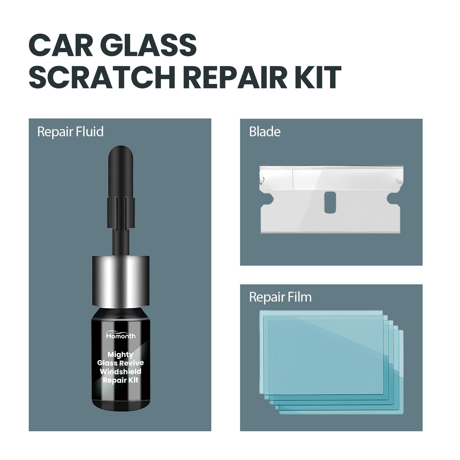 Our windshield repair kit contains UV glue. It can be applied to repair cracks on the glass, such as spider webs, star damage, long line cracks, scratches, etc. Fast curing speed, can save waiting time, suitable for emergency treatment of glass cracks. Its use method is very simple: 1. Take an appropriate amount of this product drop on the affected area, and then apply the film to the affected area; 2. Gently scrape the bubbles off the film with a blade; 3. Move the vehicle to direct sunlight for 10-30 minutes; 4. After removing the film, scrape the remaining liquid off the glass with a blade. Small damage can be quickly and effectively repaired within 20-30 minutes, the repair effect is good, very convenient. With waterproof effect, regardless of wind and sun, it can protect your glass well!