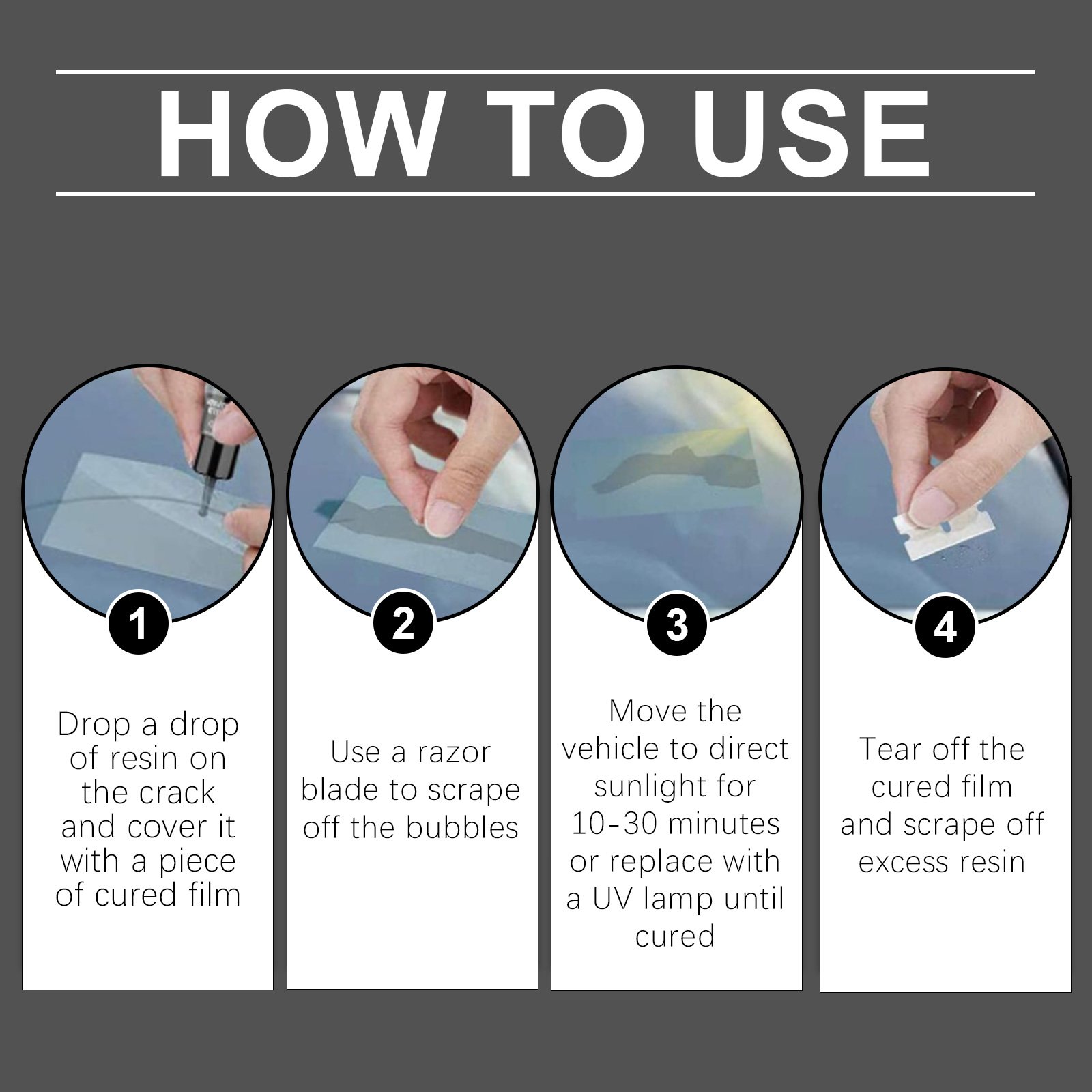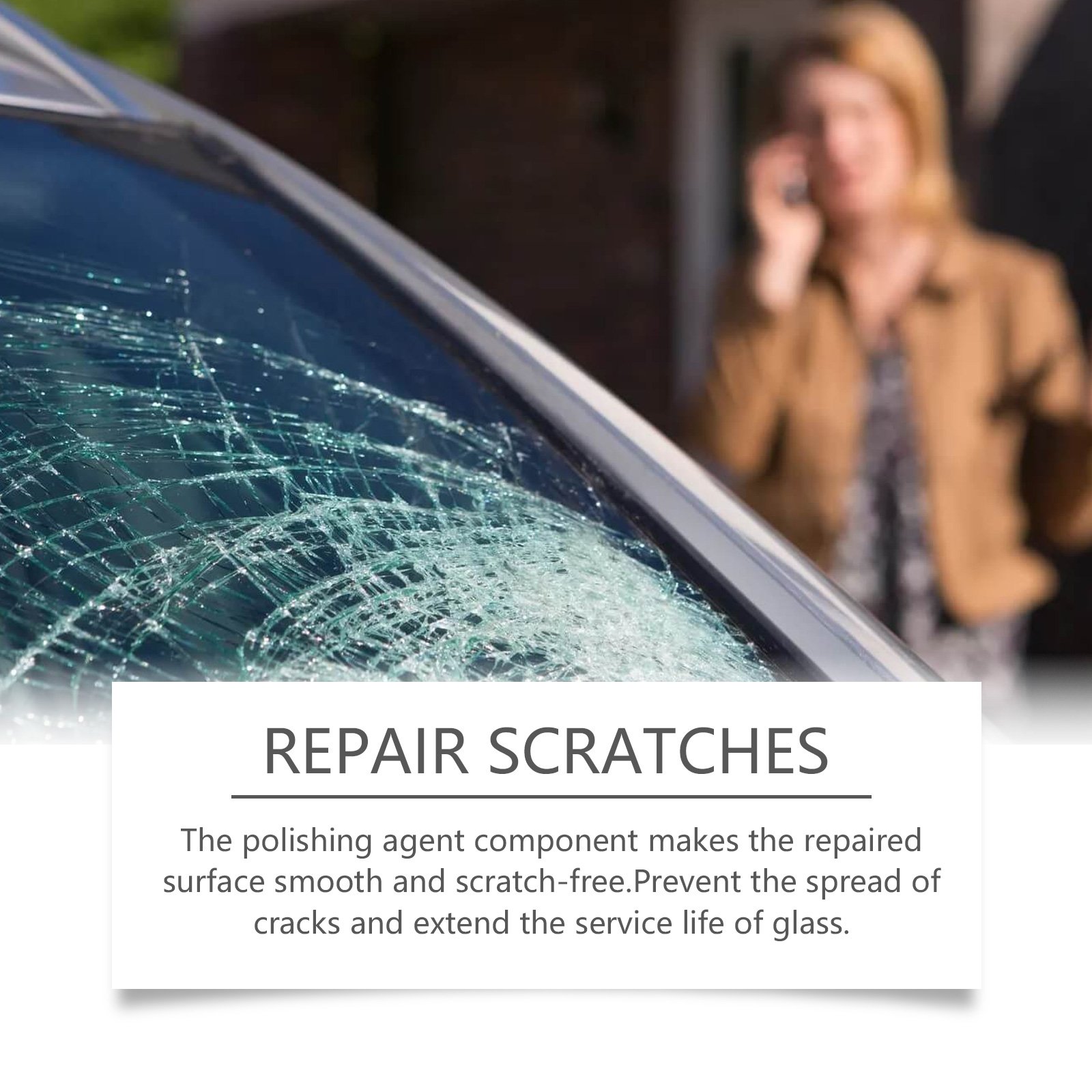Our car glass care kit contains UV glue. It can quickly repair cracks, lasting effect, not easy to fall off; Improve the transparency of the glass, restore new visual effects; Easy to operate, no professional skills can be repaired; Enhance the strength of glass, effective resistance to external impact. Its use method is very simple: 1. Drop a drop of resin on the crack and cover it with a curing film; 2. Remove air bubbles with a razor blade; 3. Move the vehicle to direct sunlight for 10-30 minutes, or replace it with ultraviolet lamp until curing; 4. Tear off the curing film and scrape off excess resin. Epoxy components ensure a strong structure after repair. The adhesive is firmly bonded to ensure the stability of the repair parts.