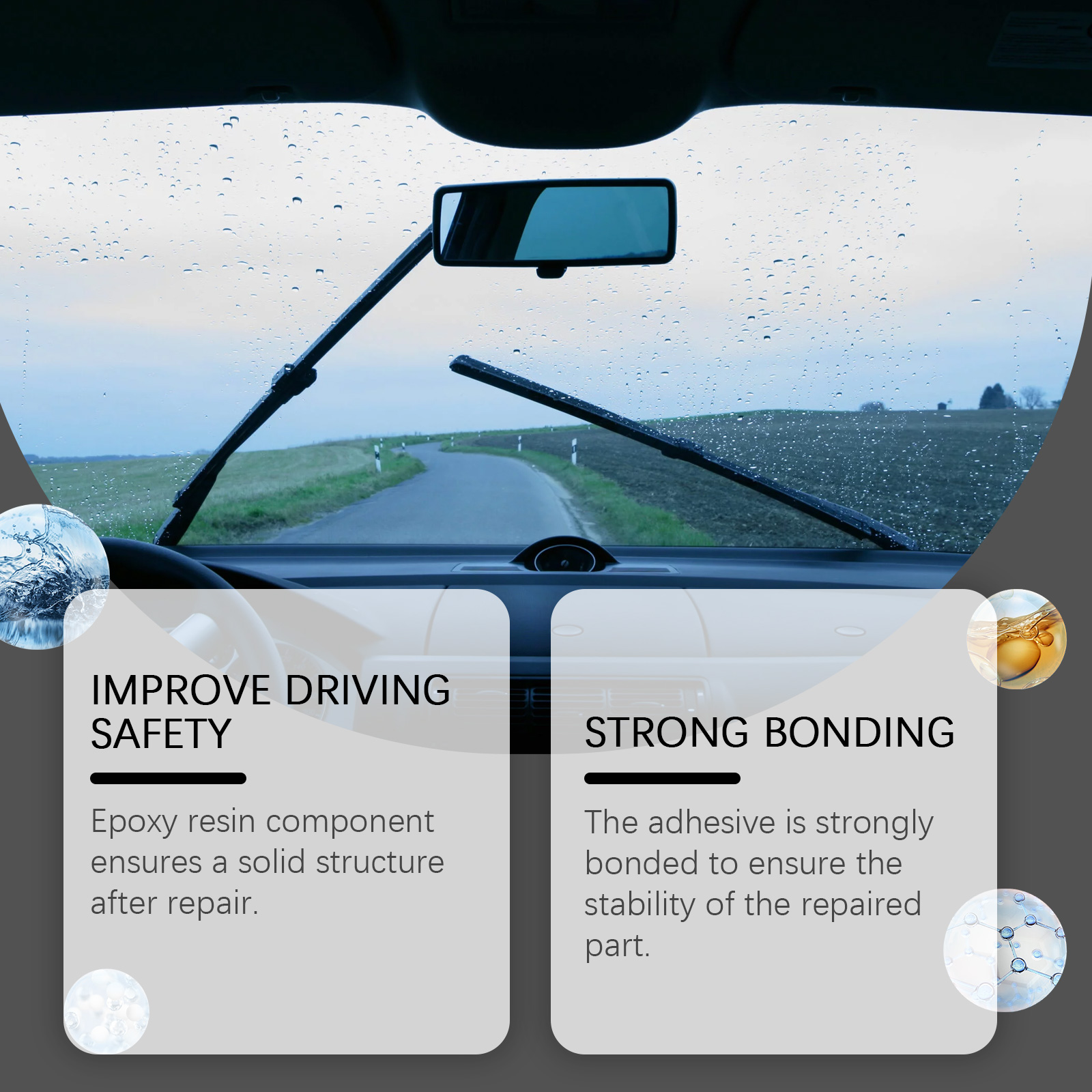 Our car windshield crack solution contains UV glue. It can make the repaired surface smooth without scratches. Prevent crack spread and prolong the service life of glass. Its use method is very simple: 1. Drop a drop of resin on the crack and cover it with a curing film; 2. Scrape off the air bubbles with a blade. 3. Move the vehicle to direct sunlight for 10-30 minutes, or replace the UV lamp until it solidifies. 4. Tear off the curing film and scrape off excess resin. Epoxy components ensure a strong structure after repair. The adhesive is firmly bonded to ensure the stability of the repair parts.
