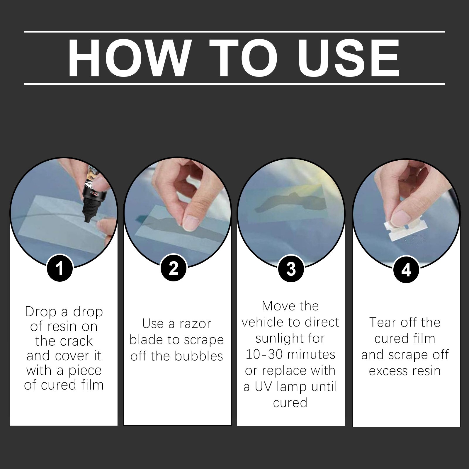 Our car windshield repair solution contains deionized water, nano titanium oxide, mineral oil. It can quickly penetrate the glass cracks and repair the glass surface in a short time. Prevent the expansion of glass cracks, enhance the stability of glass, and improve your driving safety. Its use method is very simple: 1. Drop a drop of resin on the crack and cover it with a curing film; 2. Remove air bubbles with a razor blade; 3. Move the vehicle to direct sunlight for 10-30 minutes, or replace it with an ultraviolet lamp until it is cured; 4. Tear the curing film and scrape off excess resin. The repaired glass can be restored to close to its original strength, extending the service life of the glass.
