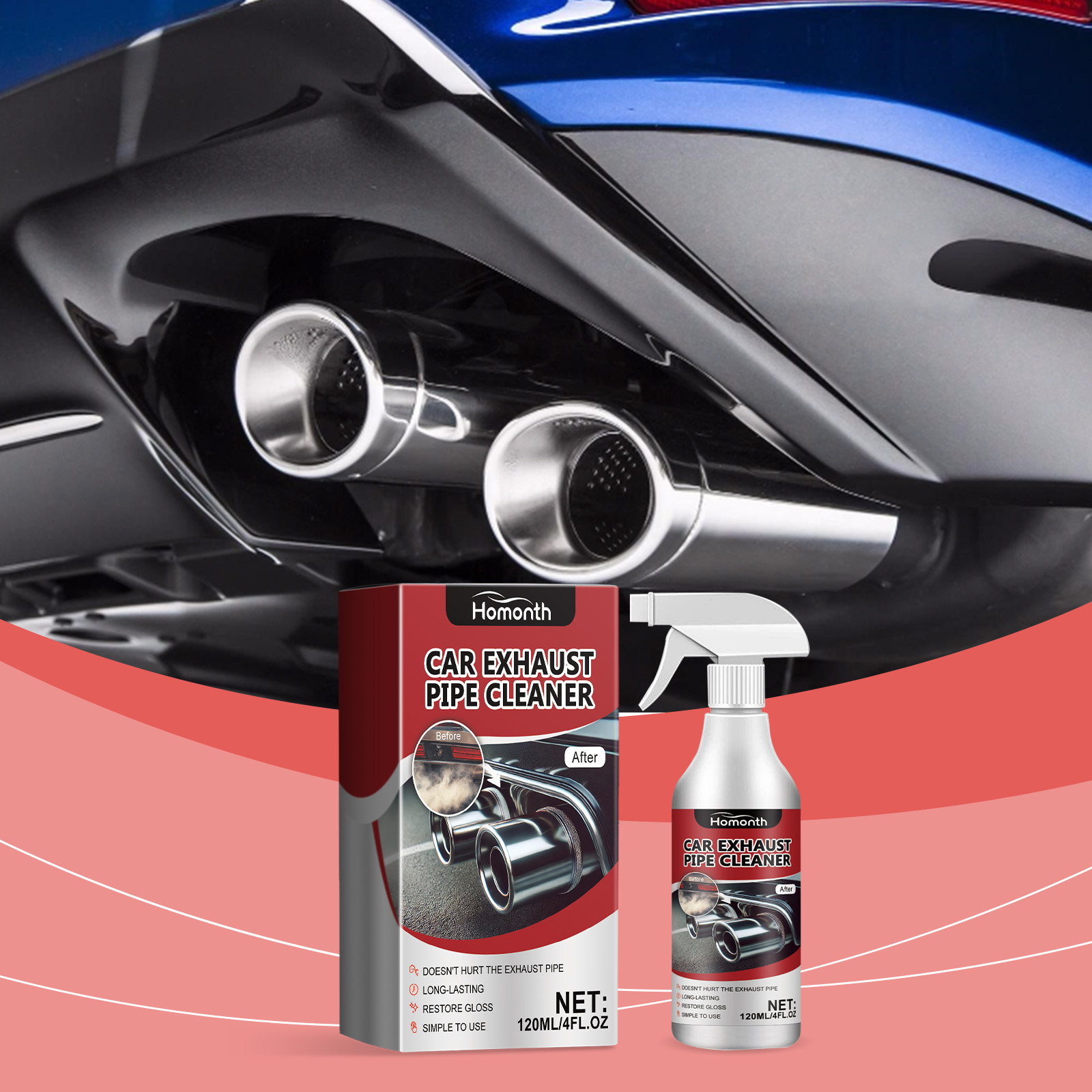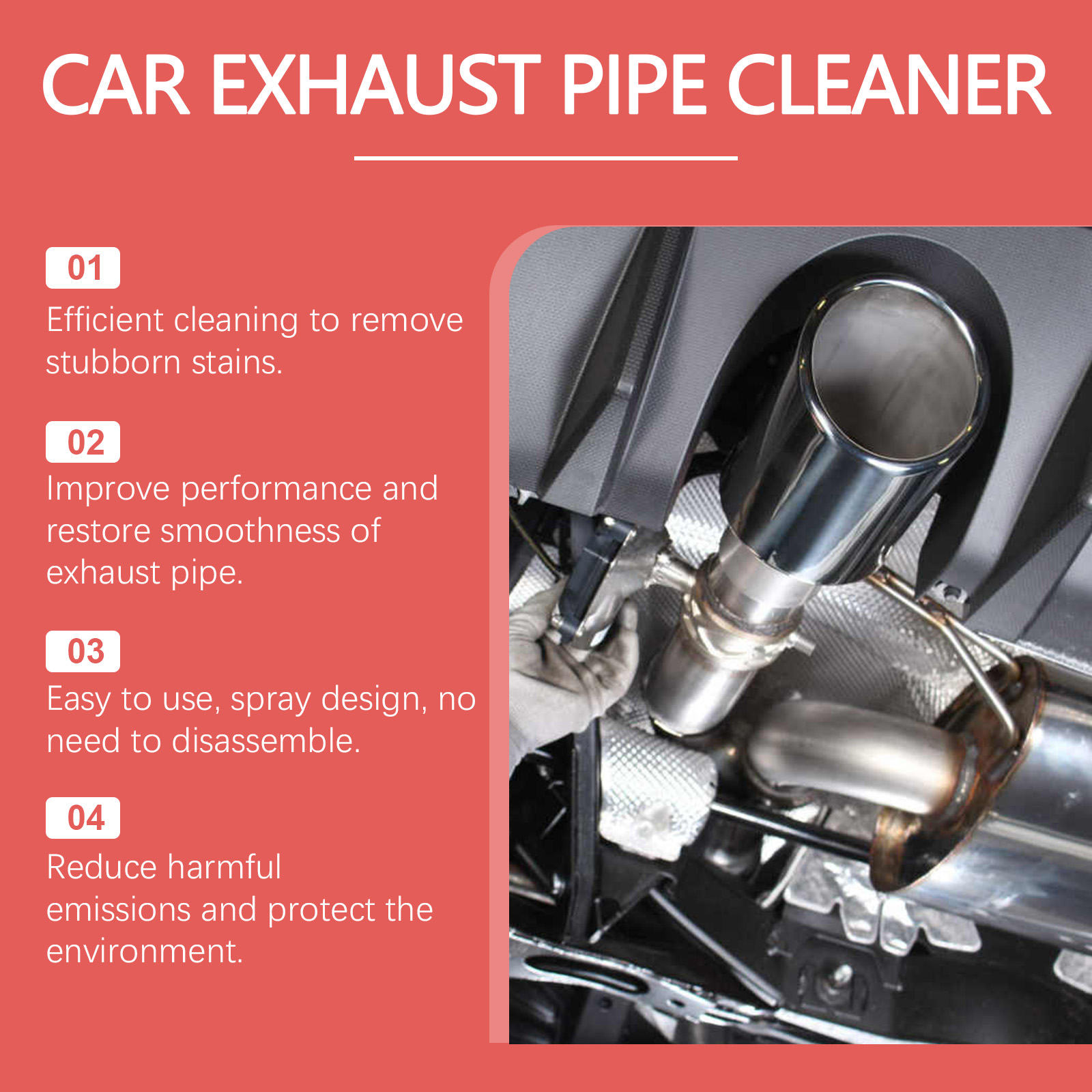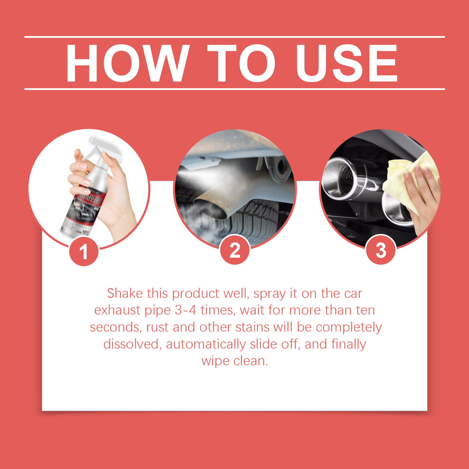 Our car exhaust cleaner contains disodium EDTA, sodium bicarbonate, lauryl ether 7. It can be used for deep cleaning and rust removal, removing atomized and rusty particles from the metal surface, so that the exhaust pipe is in the best condition. Its use method is very simple: shake the product, spray on the car exhaust pipe 3-4 times, wait more than ten seconds, rust and other stains will be completely dissolved, automatic slide, and finally wipe clean. Long-term protection, no damage to the exhaust pipe surface, extend the service life of the machine.