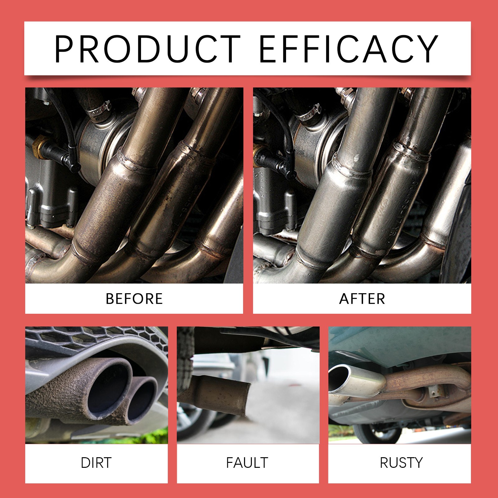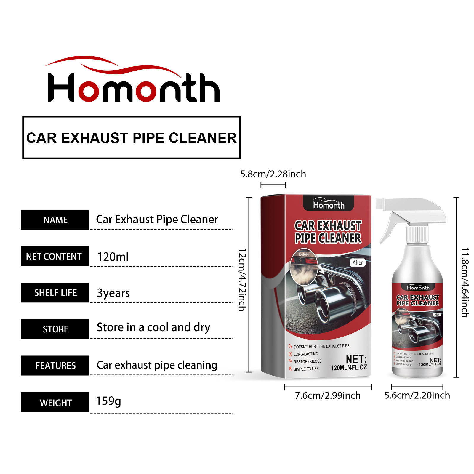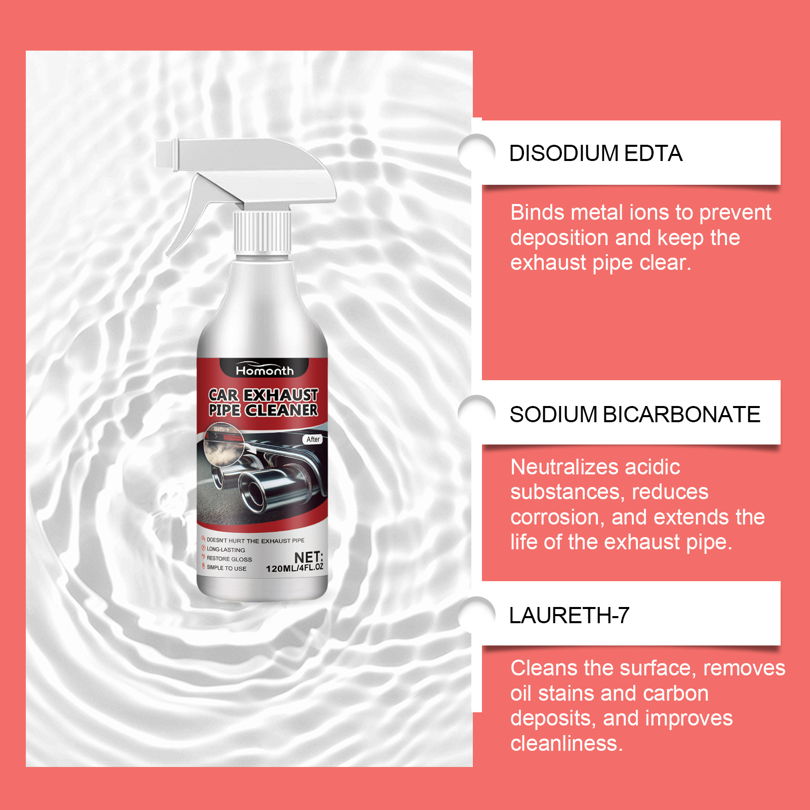 Our car exhaust cleaner contains disodium EDTA, sodium bicarbonate, lauryl ether 7. It can be used for deep cleaning and rust removal, removing atomized and rusty particles from the metal surface, so that the exhaust pipe is in the best condition. Its use method is very simple: shake the product, spray on the car exhaust pipe 3-4 times, wait more than ten seconds, rust and other stains will be completely dissolved, automatic slide, and finally wipe clean. Long-term protection, no damage to the exhaust pipe surface, extend the service life of the machine.