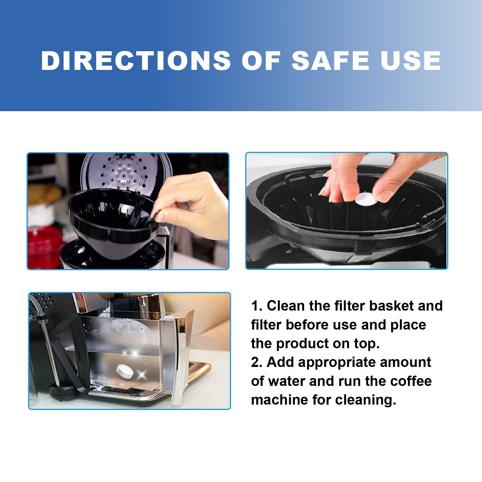 Our coffee machine cleaning tablets contain sodium bicarbonate and citric acid. It can be strong cleaning, can deeply clean the coffee machine, thoroughly clean the coffee grounds, coffee oil and other dirt, help to remove the odor inside the coffee machine, so that the coffee machine will not affect the taste and aroma of the coffee when making coffee. Its use method is very simple: put the filter basket and filter on the top before use, add the right amount of water and run the coffee machine for cleaning. It can clean the internal parts of the coffee machine, reduce blockage and failure, and extend the service life of the coffee machine.