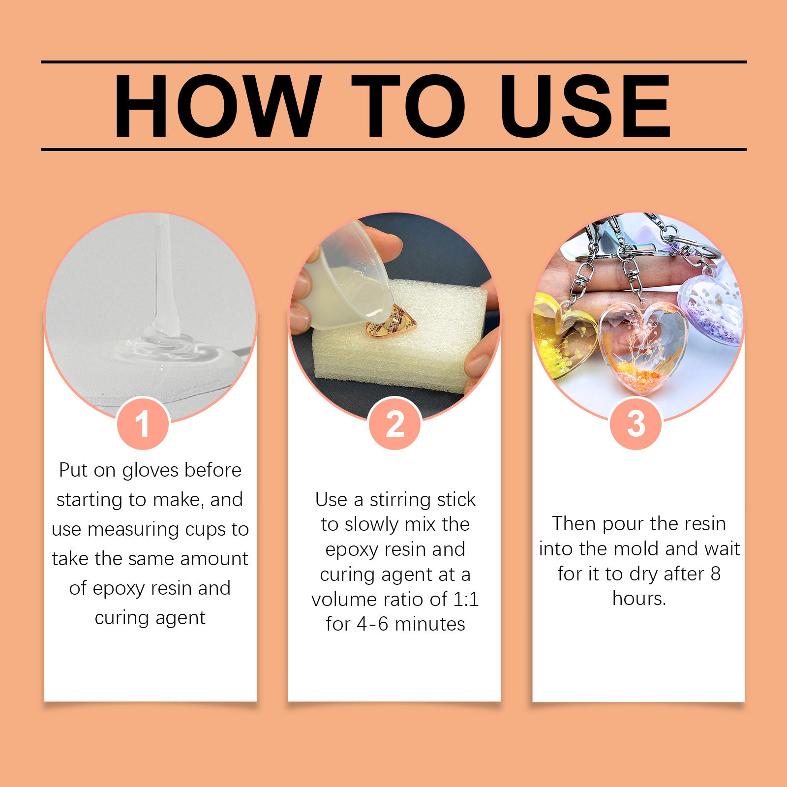 Our transparent epoxy resin kit is carefully formulated with epoxy resin and acrylic resin. Designed specifically for rapid curing and molding. The usage method is extremely convenient: Before starting to make, put on gloves and take equal amounts of epoxy resin and curing agent with a measuring cup. Use a stirring rod to slowly mix the epoxy resin and curing agent in a volume ratio of 1:1 for 4 to 6 minutes. Then pour the resin into the mold and wait for 8 hours to dry. And it can be widely used in casting process products, such as jewelry, glass cups, key chains, etc.