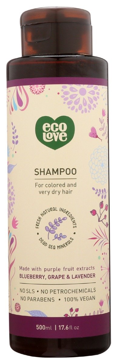 EcoLove Purple Collection Natural Shampoo is free from SLS, parabens, and petrochemicals. 95% nature-derived ingredients (30% organic). Enriched with essential oils, organic herbs & plant extracts, and 26 Dead Sea minerals.