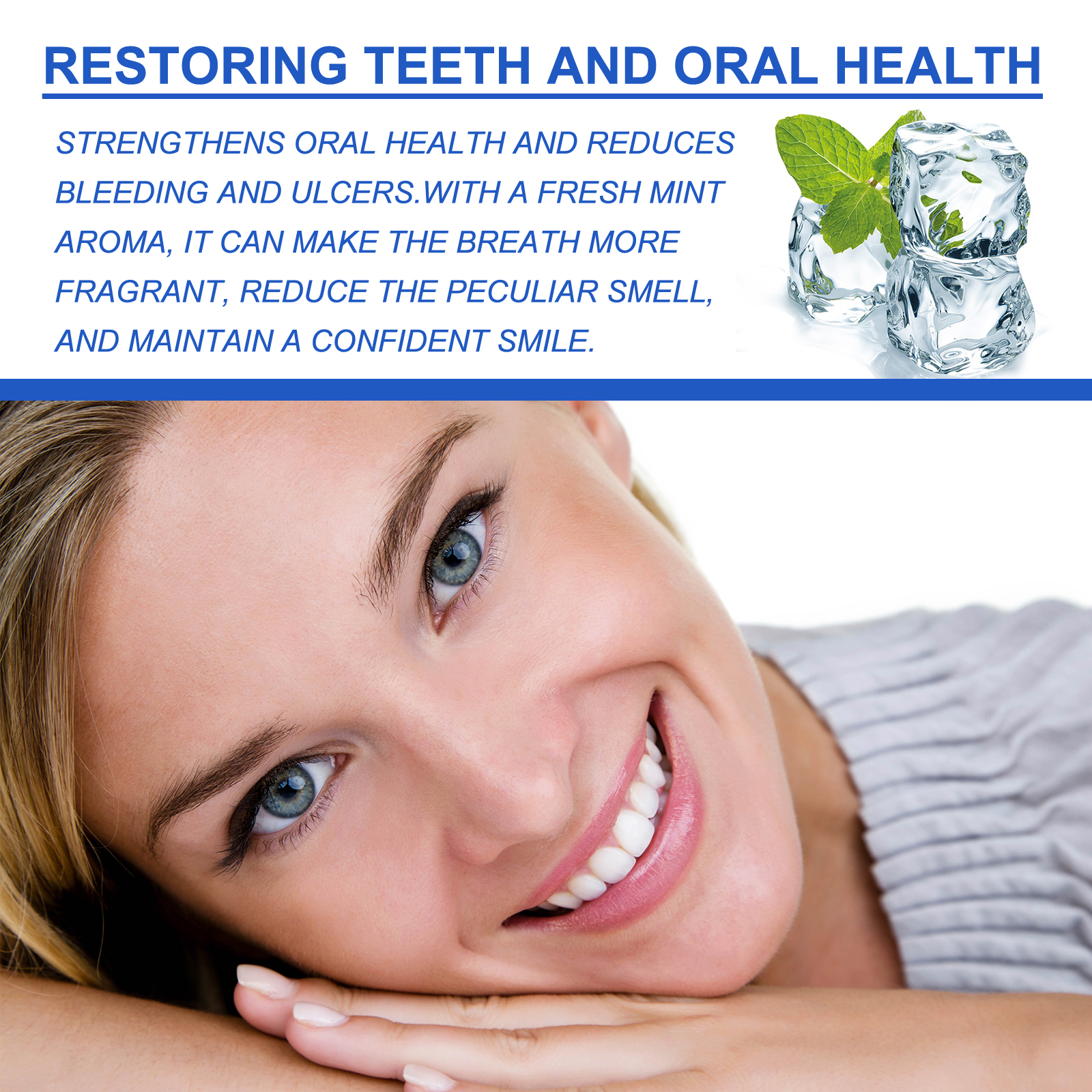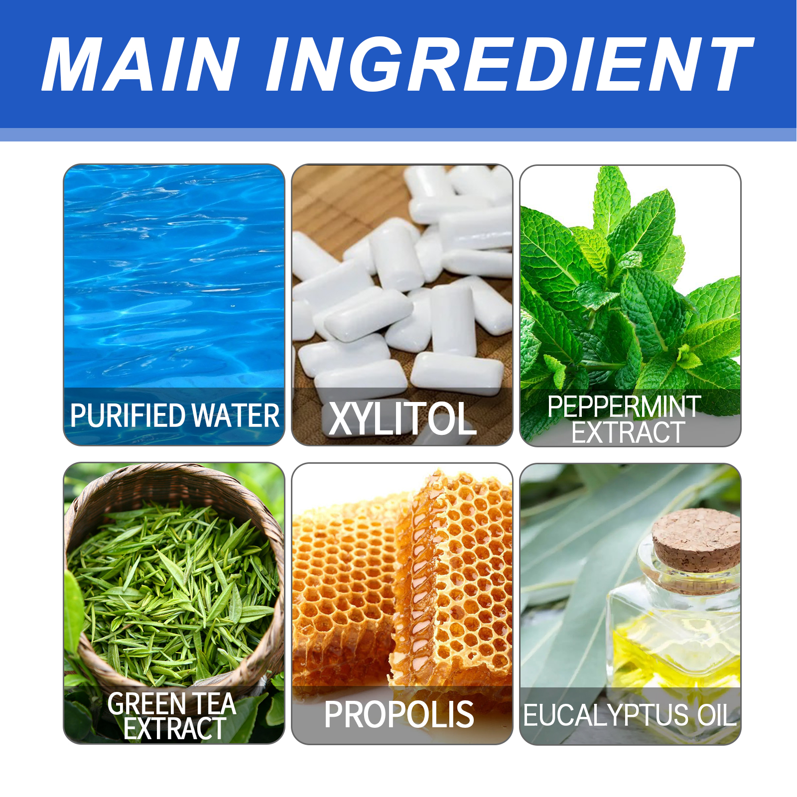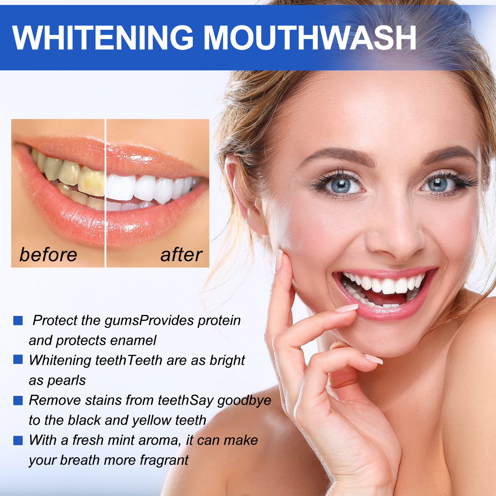 Our brightening mouthwash contains purified water, xylitol, peppermint extract and more. The ingredients it contains help make teeth whiter and reduce yellow teeth and tartar. Reduce the acidity of saliva, reduce the corrosion of teeth caused by tartar accumulation, promote the remineralization of teeth and reduce the occurrence of tooth decay. How to use it is simple: 1. Take a cup of mouthwash and put it in your mouth. 2. Gargle for about 20 seconds and then spit out. 3. Daily use can achieve better results. It provides protein and protects tooth enamel, whitens teeth, teeth as bright as pearls, removes stains from teeth Farewell to black and yellow teeth, with a fresh mint aroma, and makes your breath more fragrant.