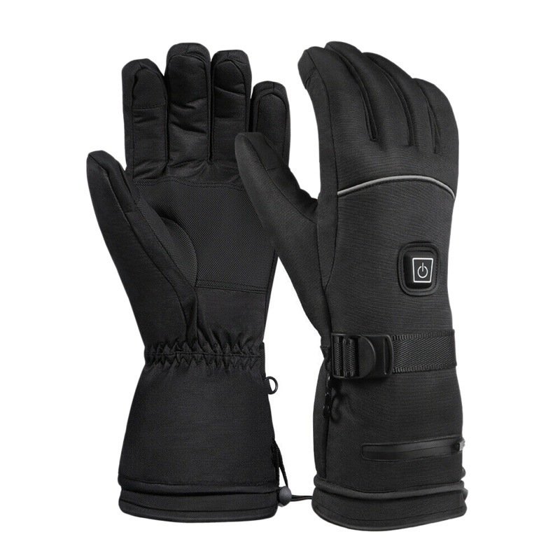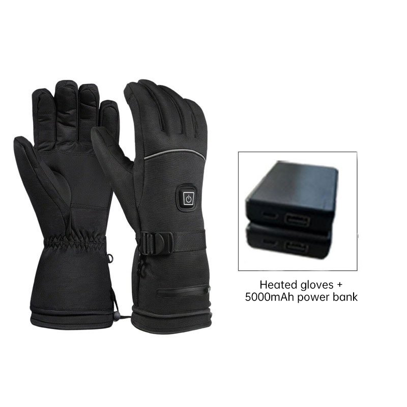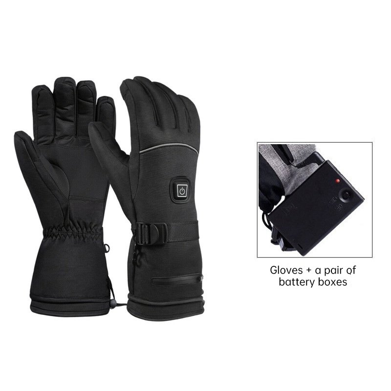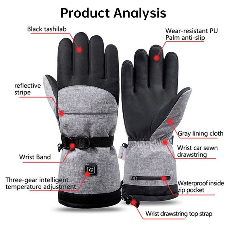 Product: Smart Electrically Heated Gloves Material: Outer shell made of black leather-like fabric with a grey inner lining. Size: L Dimensions: Total length: 34 cm; Palm circumference: 19-22 cm; Middle finger length: 8.5-9 cm. Power & Heating: Voltage: 4.5V (powered by 3 AA batteries). Heating Elements: Features imported composite fiber heating wires. Coverage: Provides full five-finger and entire back-of-hand heating. Key Features: Remove batteries before washing. Cover the DC power jack's waterproof cap. Machine washable (recommended to use a laundry bag). Do not tumble dry at high temperatures or iron. Versatile Use: Ideal for various outdoor activities like skiing and cycling.