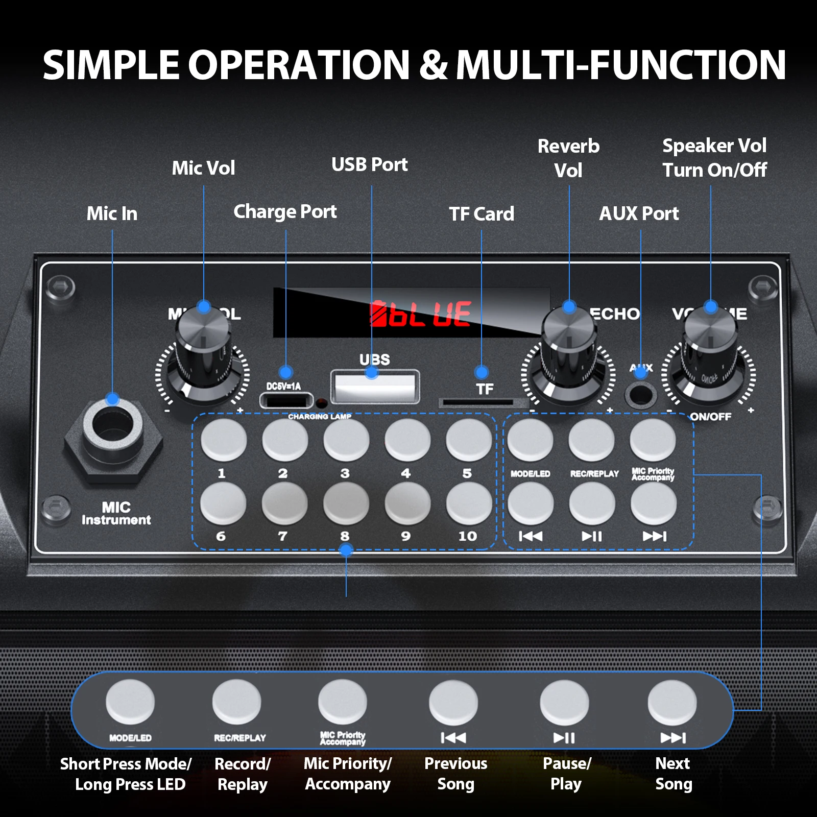 Built-in 4000 mAh rechargeable battery, it can play music continuously for 6-8 hours after fully charged. Compact and lightweight, with a shoulder strap, you can go on a musical journey and enjoy singing anytime, anywhere.