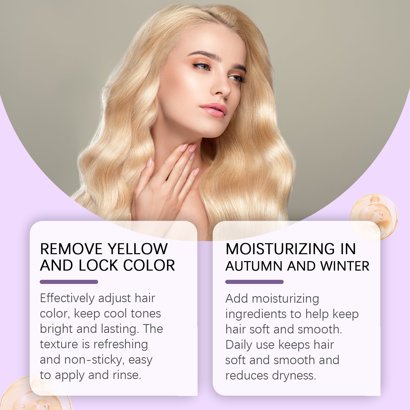 Our Nourishing purple conditioner contains violet extract, thyme extract. It can effectively adjust the hair color, keep the cool tone bright and lasting, the texture is fresh and non-sticky, easy to apply and rinse. The way to use it is very simple: moisturize your hair, evenly apply an appropriate amount to your hair, gently massage and absorb, and rinse with clean water. And can help keep hair soft and smooth, daily use can keep hair silky and reduce dryness.