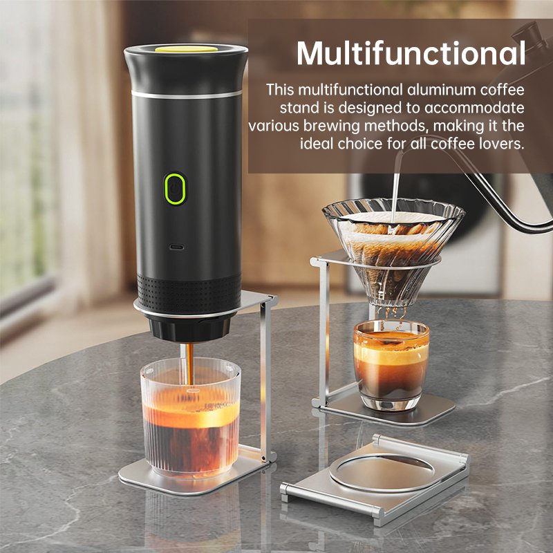 Product Overview: A lightweight, foldable aluminum alloy coffee stand designed for portable espresso machines and pour-over brewing, ideal for travel and saving space.