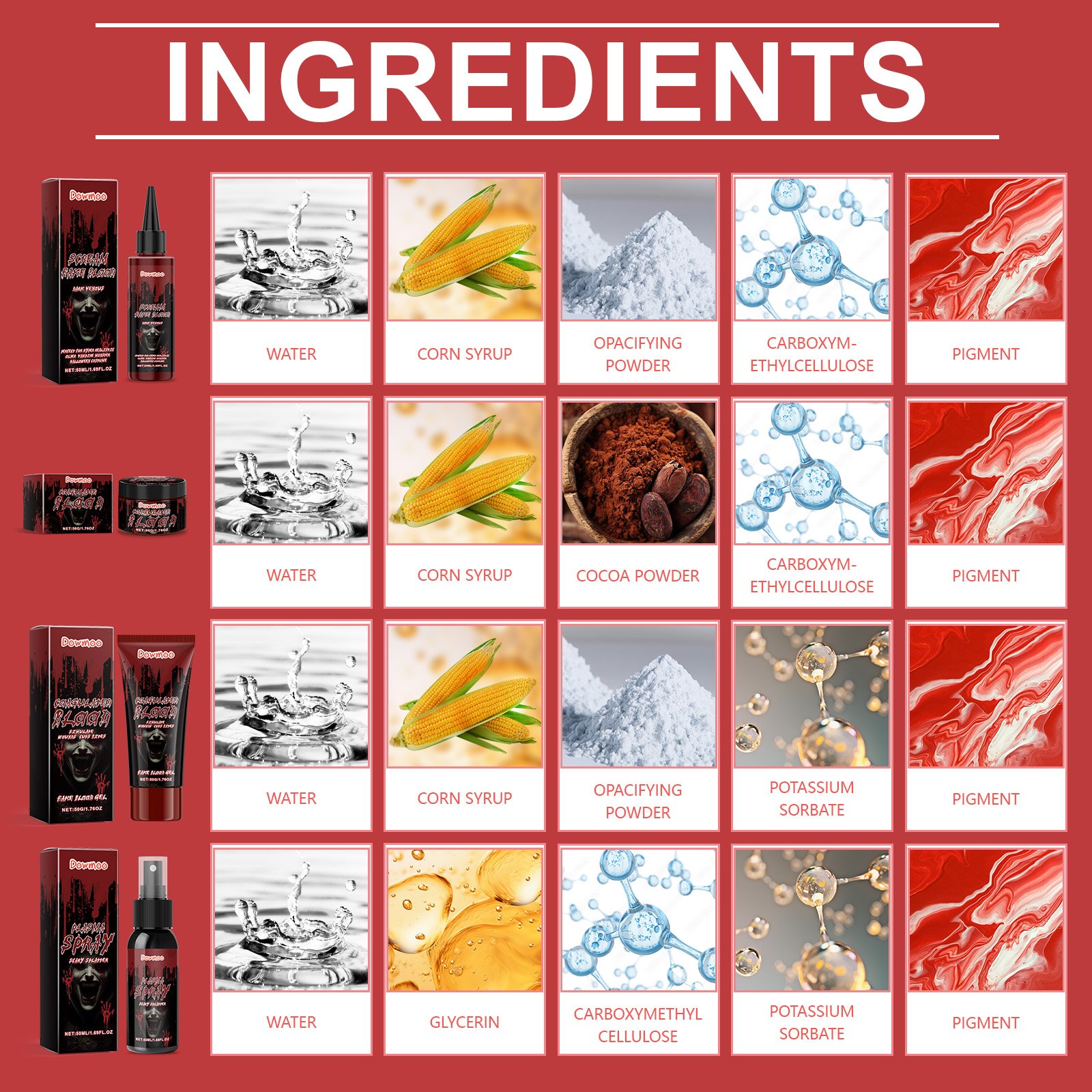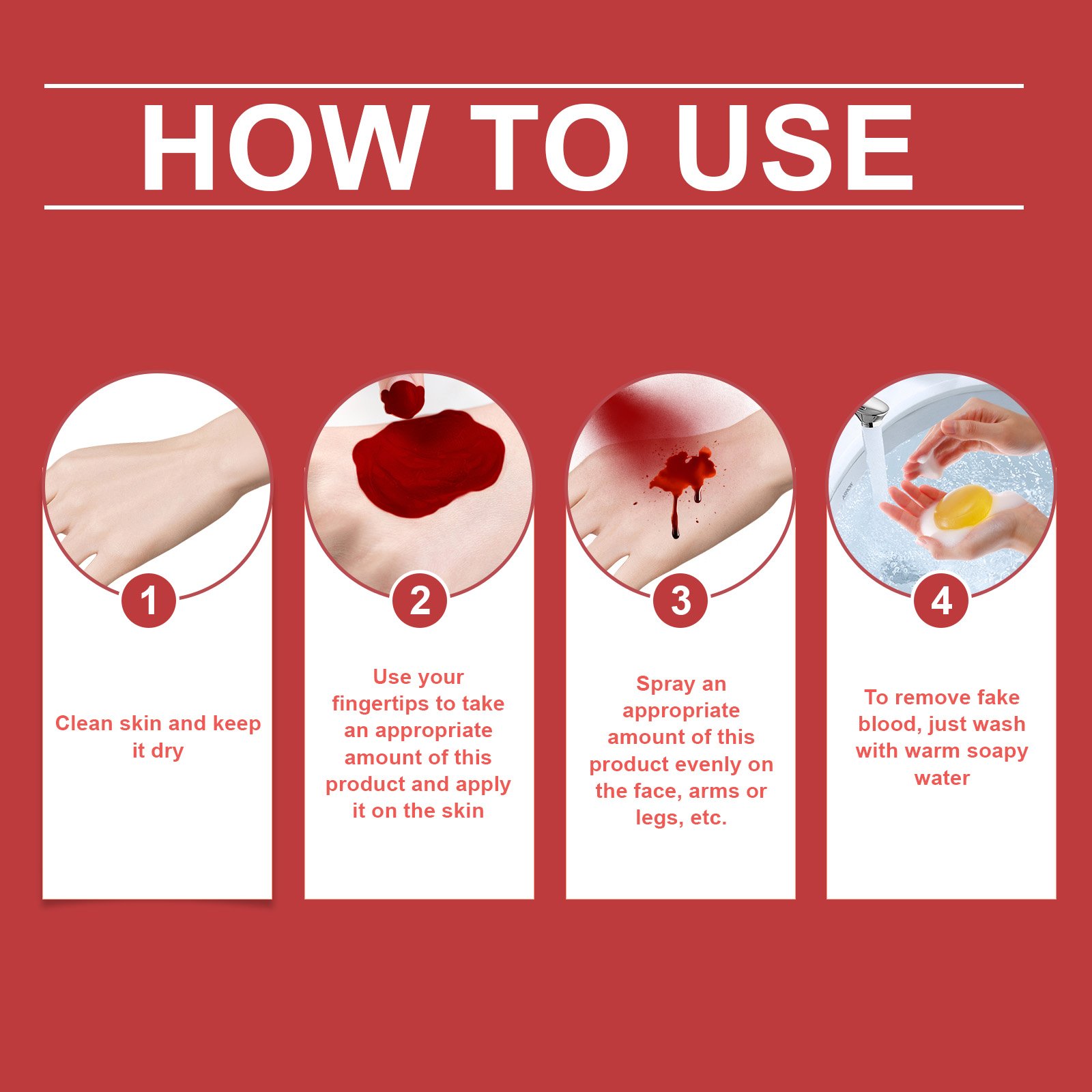 Our Halloween makeup set contains corn syrup, light blocking powder, and carboxymethyl cellulose. It can create realistic visual effects, enhance the festive atmosphere, and give people an exciting effect. Perfect for Halloween makeup and other scenes including clowns, monsters, pranks, etc. Its application method is simple: 1. Clean the skin and keep it dry; 2. Apply appropriate amount of the product to the skin with fingertips; 3. Take appropriate amount of this product and spray evenly on the face, arms or legs. 4. To remove fake blood, simply wash it with warm, soapy water. It uses safe ingredients that won’t irritate the skin, allowing you to use it with confidence. Suitable for all skin types and safe to use.