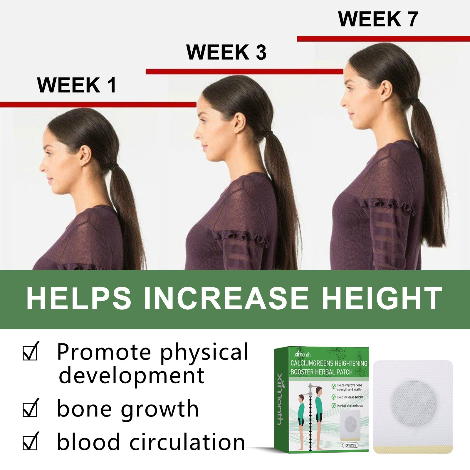 Our herbal boost patch contains collagen, vitamin D, and tangerine. It provides important elements for bones and supplements nutrients; Helps with calcium absorption and provides a variety of health benefits. Its use is simple: after washing your feet, take a patch and stick it on the bottom of your feet for 6-8 hours. Herbal fuel patches promote physical development, bone growth, blood circulation, strengthen bones, meet your needs, and achieve your height dreams.