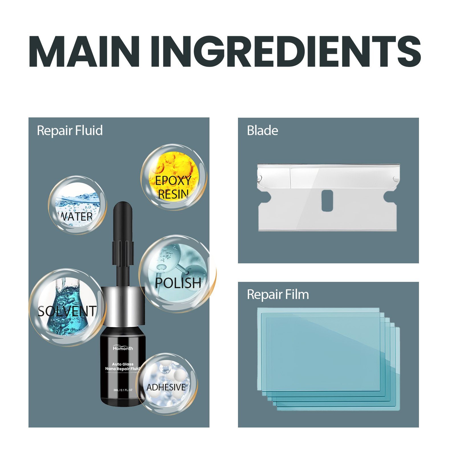 Our Auto Glass Nano Repair Fluid contains epoxy resins, solvents and polishes. It preserves the look and safety of the vehicle and also avoids the expense of replacing a potentially expensive full windshield in the future. Its use is simple: First clean the area around the damaged car glass, then use a blade to cut the cured film according to the broken length, and then apply the repair solution along the damaged area of the glass crack, and quickly cover with the cured film, press out the bubbles between the glass and the cured film, move the car to the direct sunlight for 10-30 minutes or use ultraviolet lamp instead of curing until curing, and then tear off the cured film. It can save the inconvenience of long maintenance or service appointments.