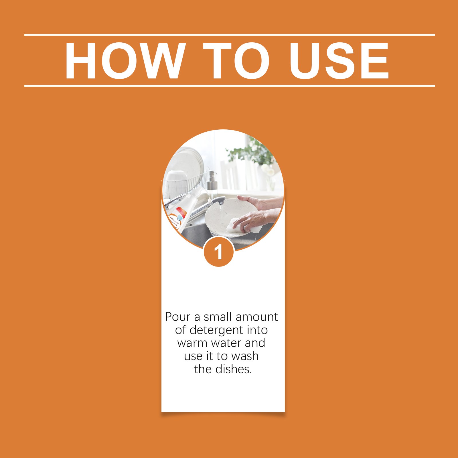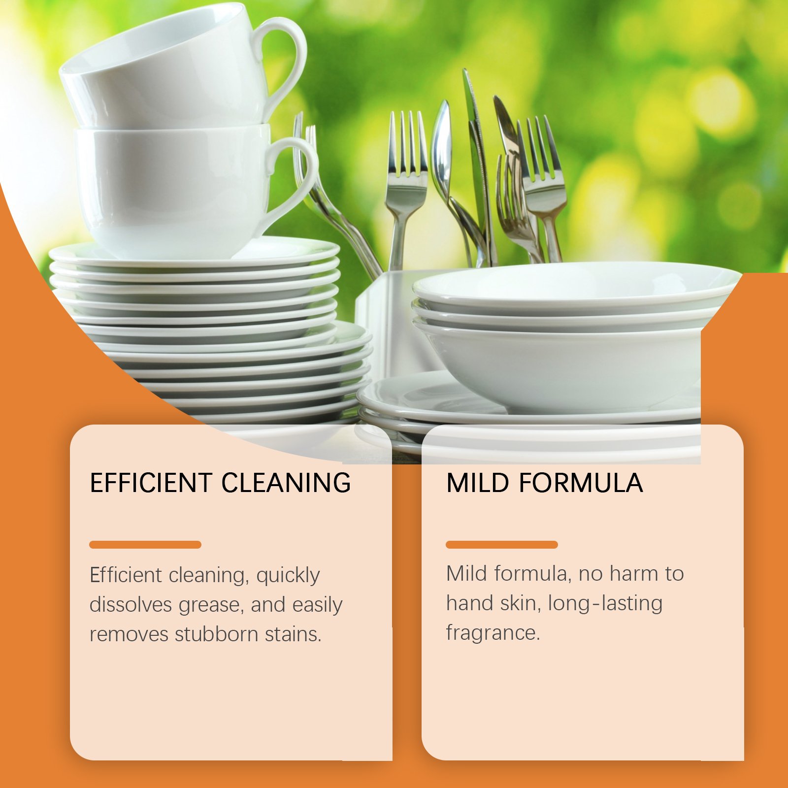Our dishwashing liquid contains disodium EDTA, sodium bicarbonate, lauryl ether 7. It cleans efficiently, dissolves grease quickly, and removes stubborn stains easily. The formula is mild, does not harm the hand skin, and has a long-lasting fragrance. Its use is simple: Pour a small amount of detergent into warm water and use it to wash dishes. Easy to rinse, highly concentrated formula, durable, one bottle can be used multiple times.