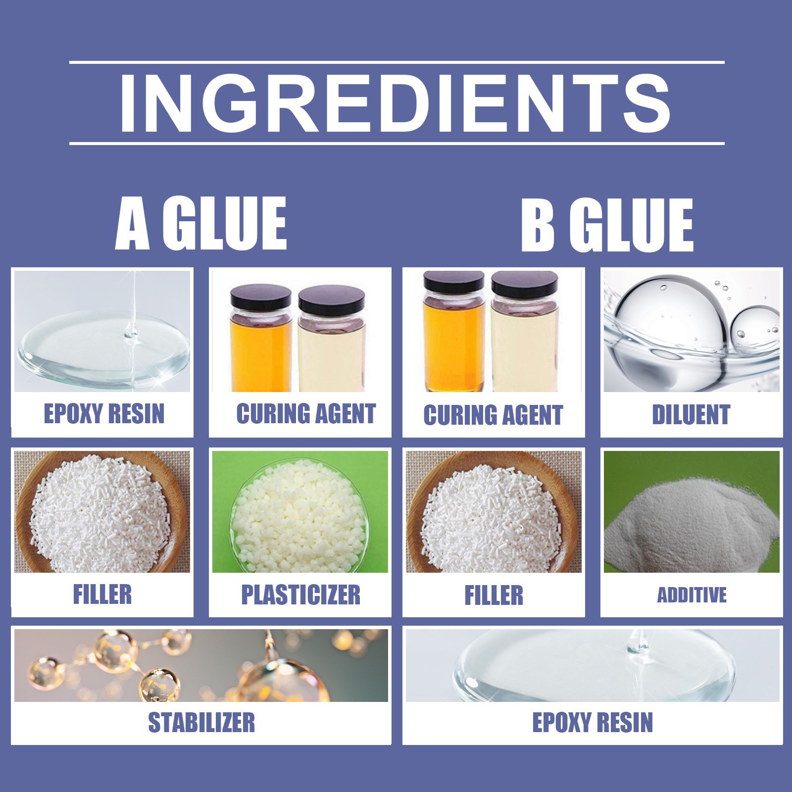 Our universal AB glue contains A glue: epoxy resin, curing agent; B adhesive filler, additive. It can effectively resist moisture and environmental erosion and extend the service life of the product. Its use method is very simple: wipe the area to be smeared clean, use a push rod to squeeze AB glue into the volume anvil at a ratio of 1:1, evenly apply the glue to the part to be repaired, wipe the gap with a scraper, and wait for a while to dry. It can be applied to a variety of materials and scenarios, easy to use, and suitable for daily maintenance in household, industrial and other fields.