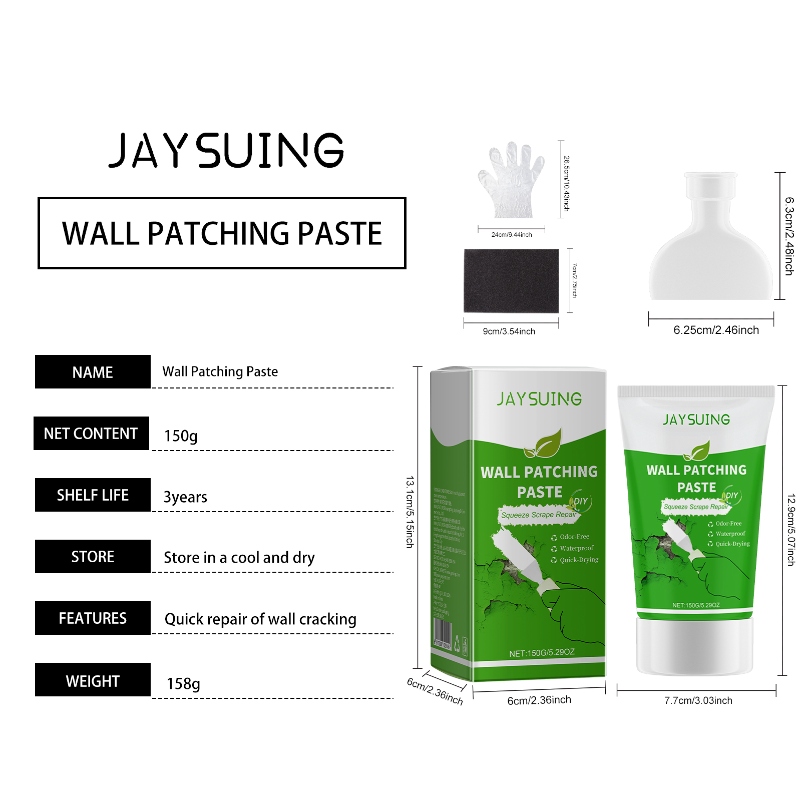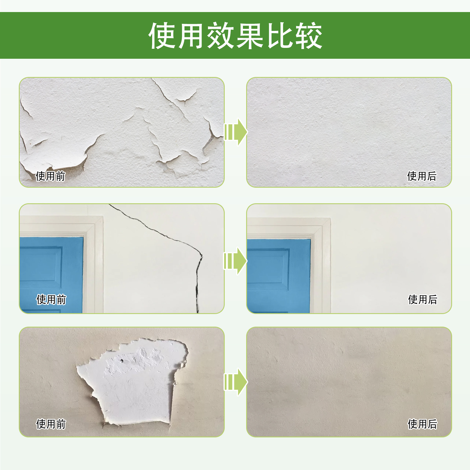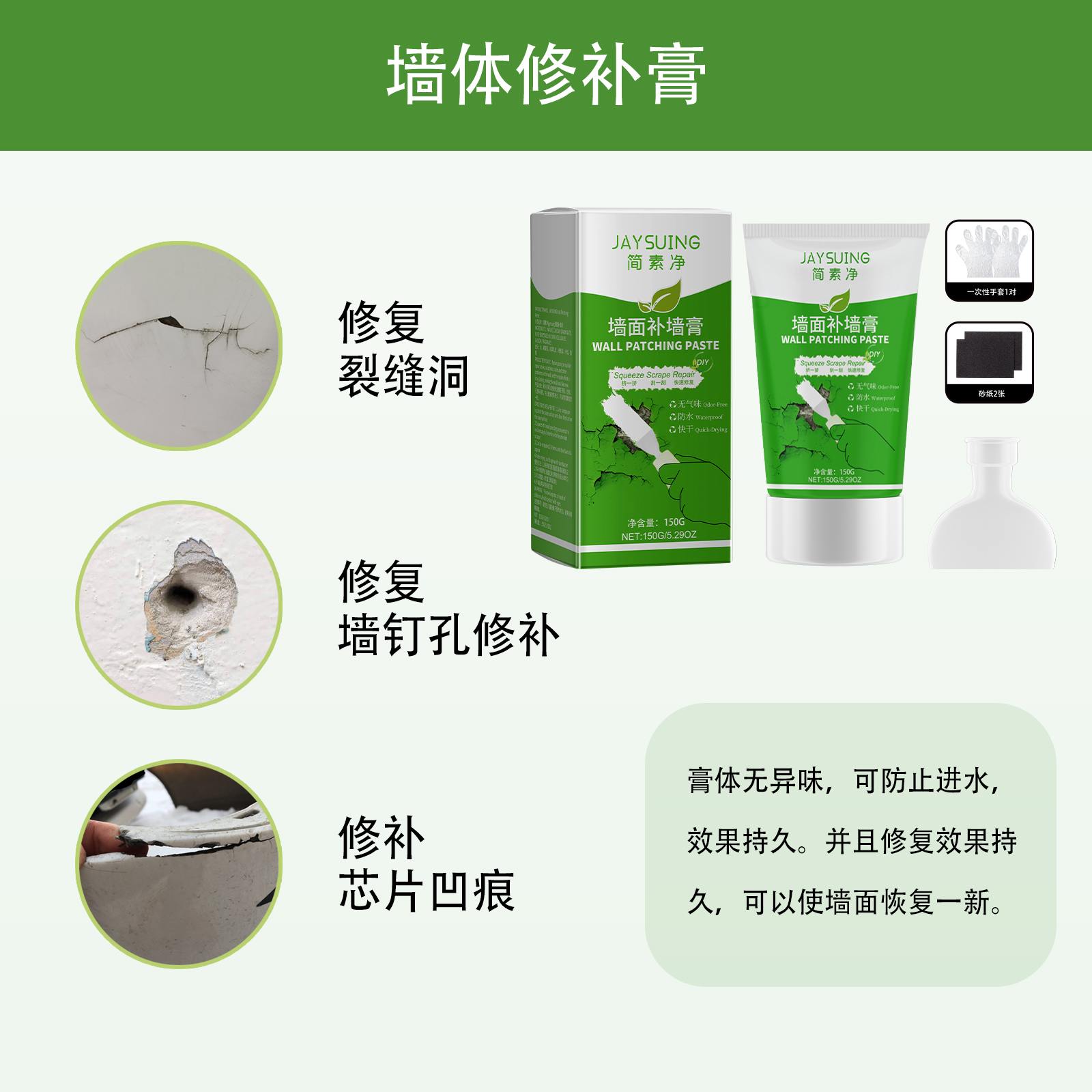 Our wall repair plaster contains pure benzene emulsion, cellulose. It can be applied to wall nail hole repair, wall stripping repair, wall peeling repair, greatly saving your energy. Its use method is very simple: 1. Polish the base surface with sandpaper, clean the dust on the base surface, 2. Squeeze the wall patch paste onto the wall and apply it evenly with the provided scraper, 3. This can be repeated 2-3 times until the defect is gone, 4. When dry, sand again with sandpaper. And it makes the walls stronger.