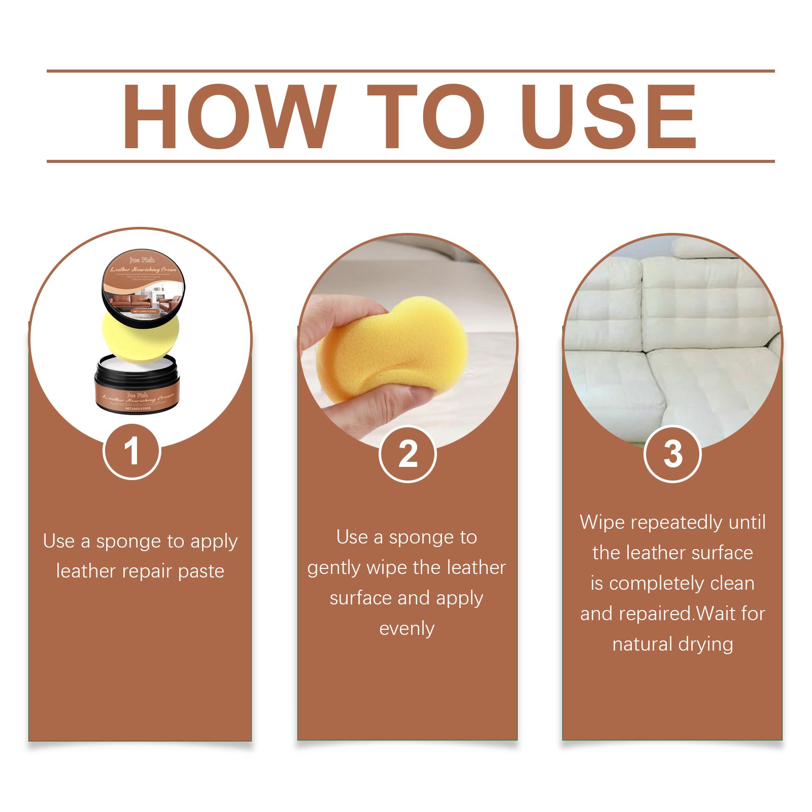 Our leather repair cream contains glycerin, beeswax and coconut oil. It can repair small scratches and worn areas to improve the overall appearance of leather. Keep leather fresh and shiny in its original condition. Its use method is very simple: apply leather repair cream with a sponge gently wipe the leather surface with a sponge, evenly apply and wipe repeatedly until the leather surface is completely clean and repaired. Allow to dry naturally. It also helps the leather resist external contamination and keep it clean. Repair wear and increase the durability of the leather.