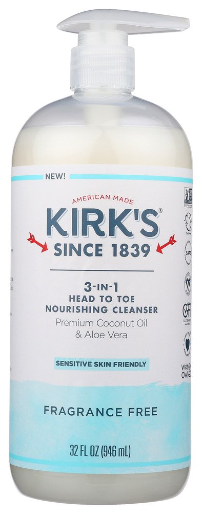 Enhanced with premium Coconut Oil and soothing Aloe Vera, our 3-in-1 cleanser leaves you feeling soft and healthy – from head to toe. Kirk’s nourishing, multi-tasking cleanser simplifies your routine – in the shower, at the sink, and around the house!