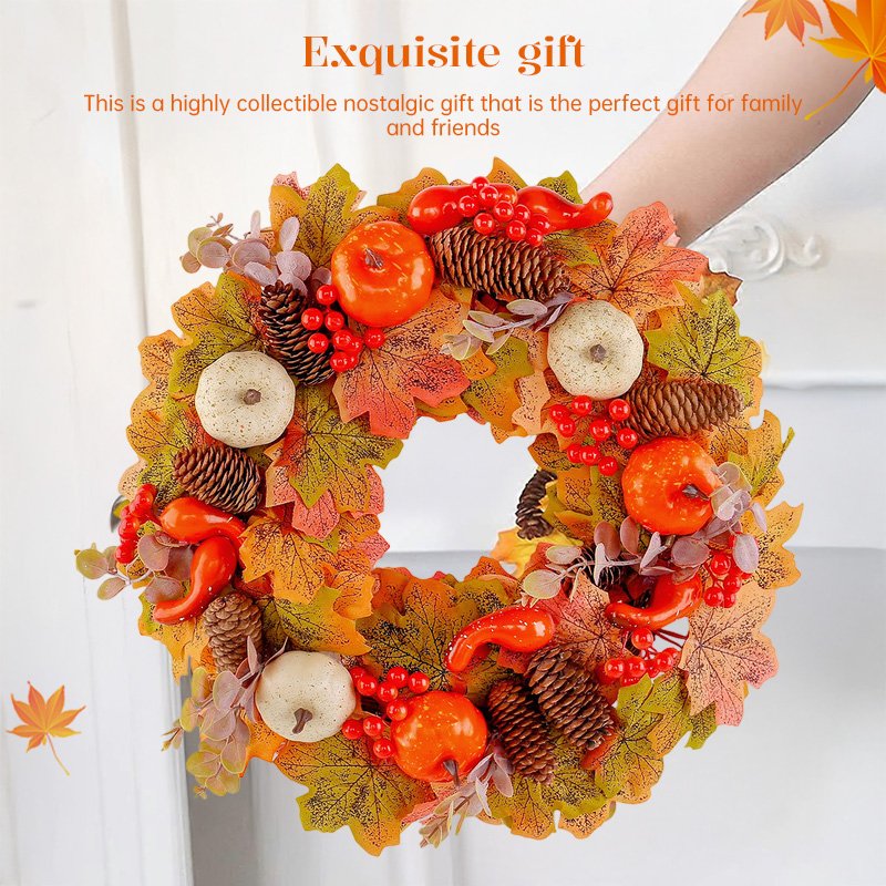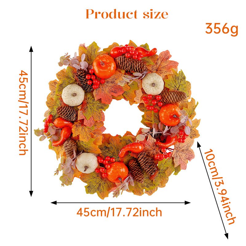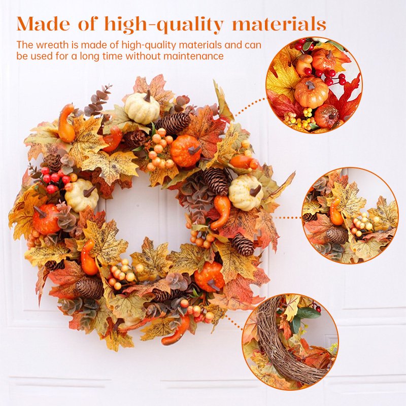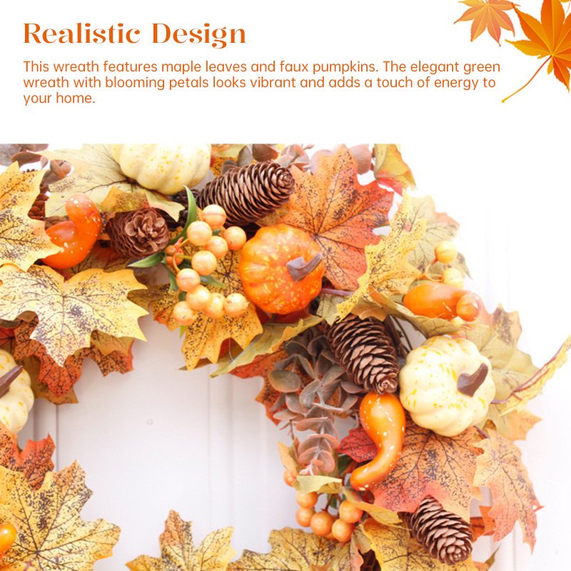 – Design & Aesthetics: Features maple leaves and artificial pumpkins; elegant green garland with blooming petals adds vibrancy and dynamism to home life.