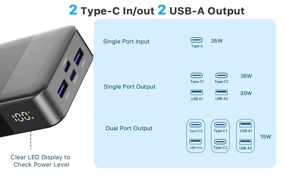【4 Outputs & 2 Inputs】Equipped with 2 USB A output ports and 2 Type C ports (both support Input & Output), this power bank allows you to charge up to 4 devices at the same time. Whether you’re sharing power with others or keeping multiple devices charged, it offers convenient, efficient charging without waiting