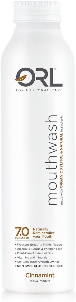 Cinnamint Mouthwash bathes teeth in an organic xylitol-rich formula that kills the bacteria responsible for cavities and inhibits plaque buildup without harmful chemicals or alcohol. Ideal for anyone who seeks a well-nourished smile, including those who struggle with conditions like dry mouth and gum disease, ORL Cinnamint Mouthwash mindfully excludes harmful ingredients that can dry your mouth out or leave behind a film, so your mouth feels deliciously cleaner after each rinse.
