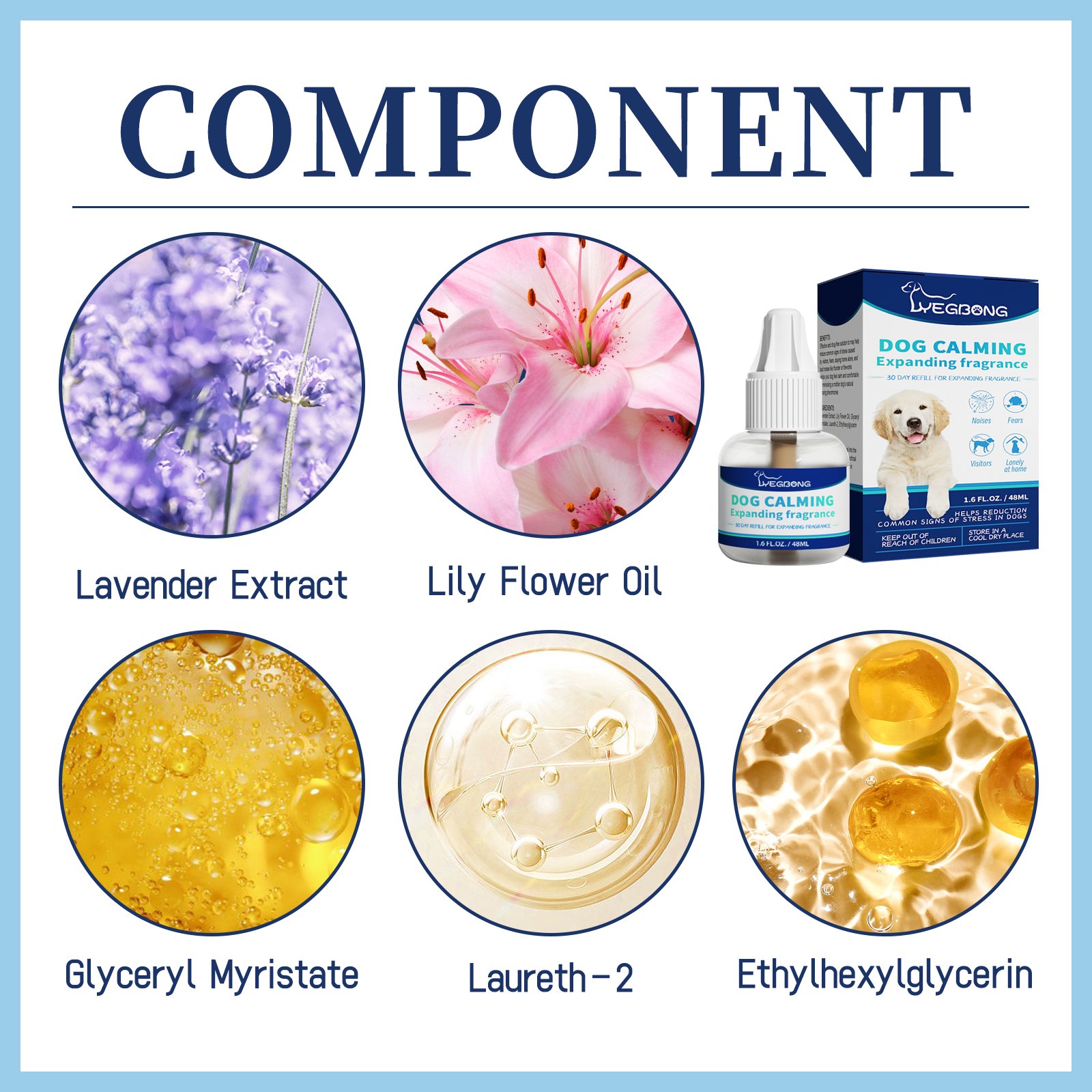 Our pet care solution contains lavender extract, lily oil, glycerin myristate. It can help your dog feel calm and relaxed at home and can help you and your dog live better together and create a reassuring environment at home. Its use is simple: first remove the cap, screw the vial into the diffuser unit, and plug it into the power outlet, leaving the diffuser plugged in. After use, let the dog reduce the common signs of stress caused by visitors, reduce the anxiety and fear of staying at home alone, and let the dog calm down.