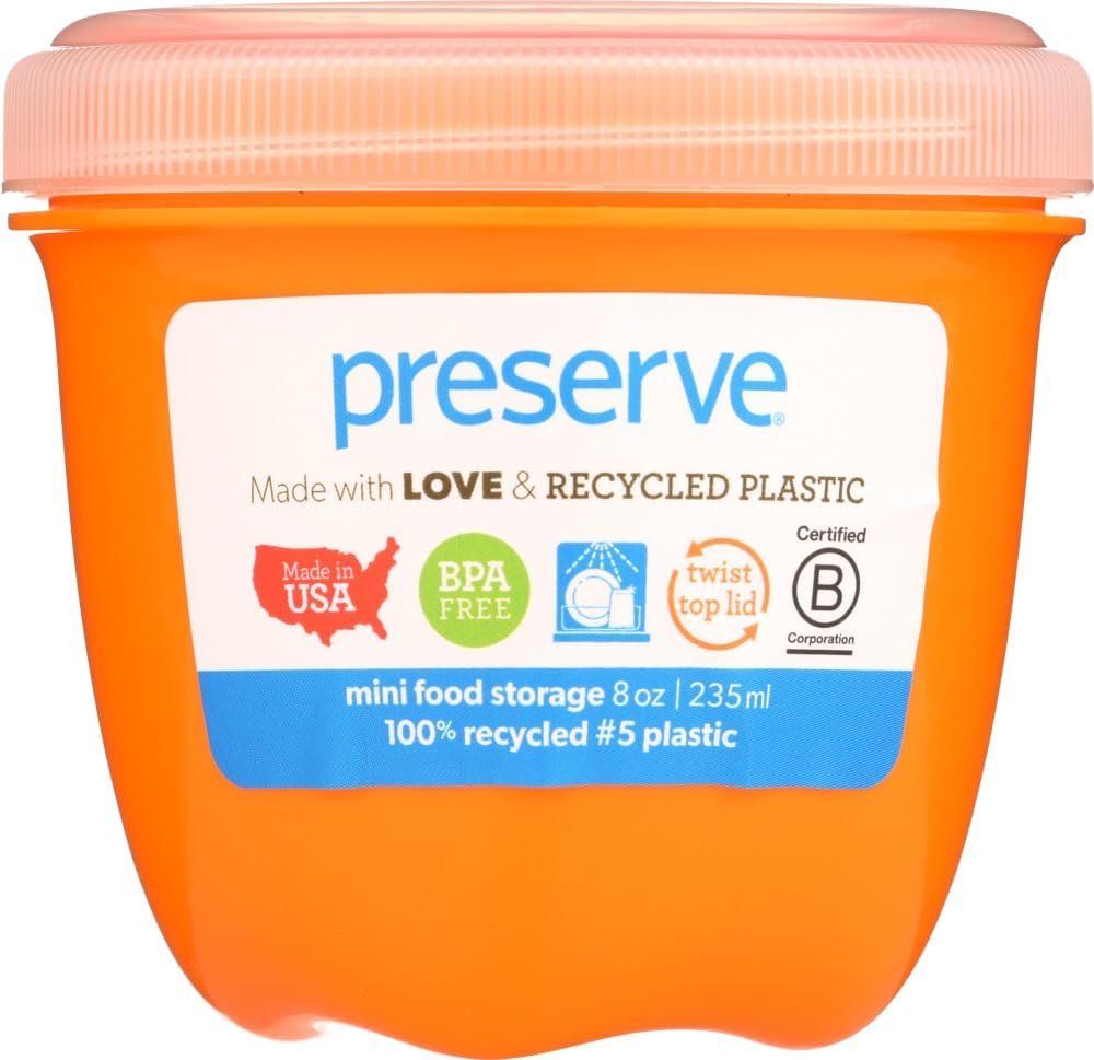 Preserve food storage containers are made in the USA from 100% BPA free, recycled #5 plastic, dishwasher safe and stand up to everyday use. The Preserve Mini Food Storage holds 8 oz. and is a friendly addition to any refrigerator or lunchbox. Our containers have innovative lids which screw on tightly to keep food fresh. They also nest for easy storage.