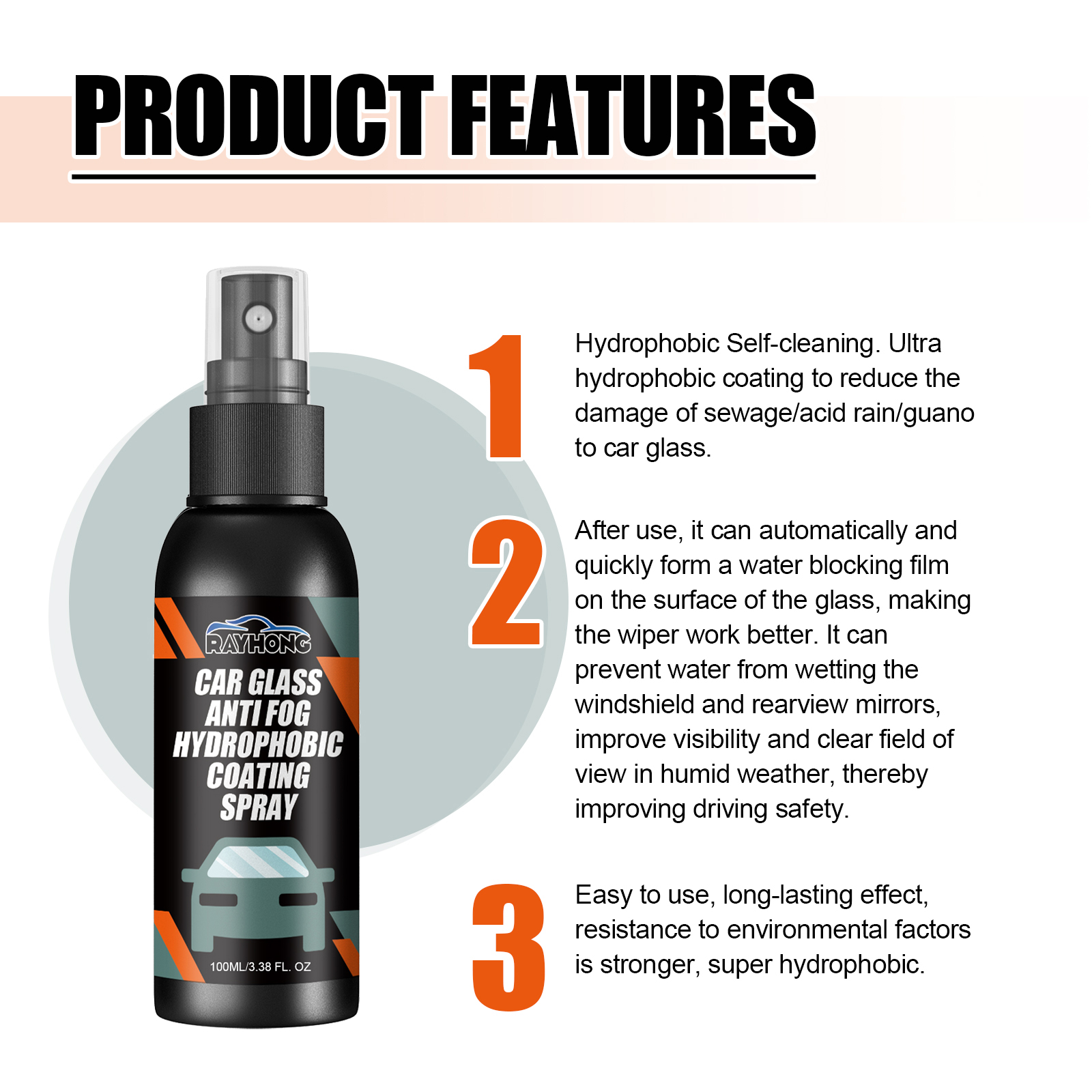Our car windshield spray contains disodium EDTA and sodium lauryl sulfate. It can reduce the damage of sewage/acid rain/rain to the car glass, automatically and quickly form a water-blocking film on the glass surface, so that the wiper can work better, prevent water from wetting the windshield and rearview mirror, improve visibility and clear vision in wet weather, thereby improving driving safety. Its use method is very simple: clean the glass and dry, take an appropriate amount of spray evenly spray on the glass, leave it for 3-5 minutes to semi-dry, and wipe the glass with a dry towel. It helps to quickly remove stubborn stains, oil film, insect stains, water stains, etc., on the surface of the glass, making driving safer.