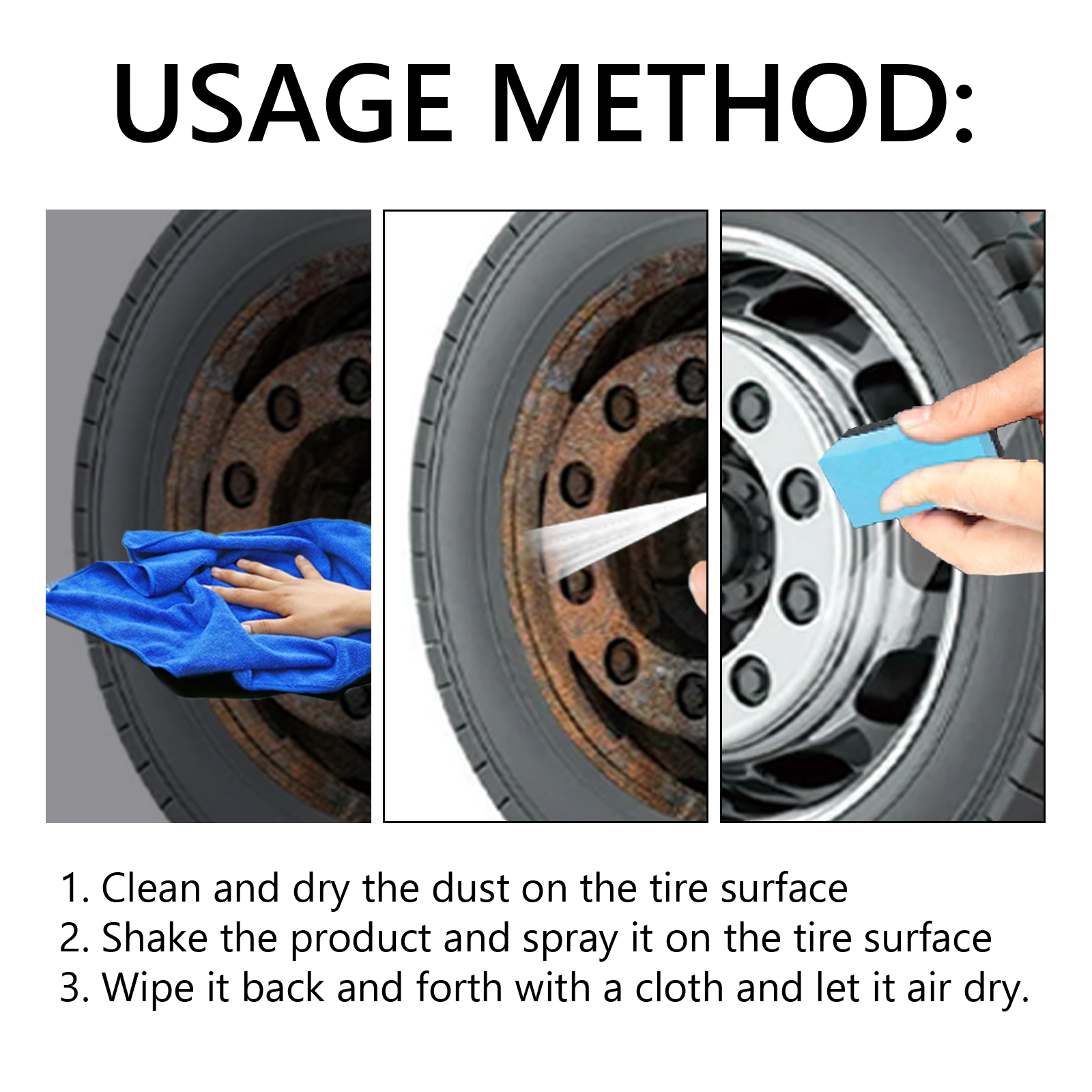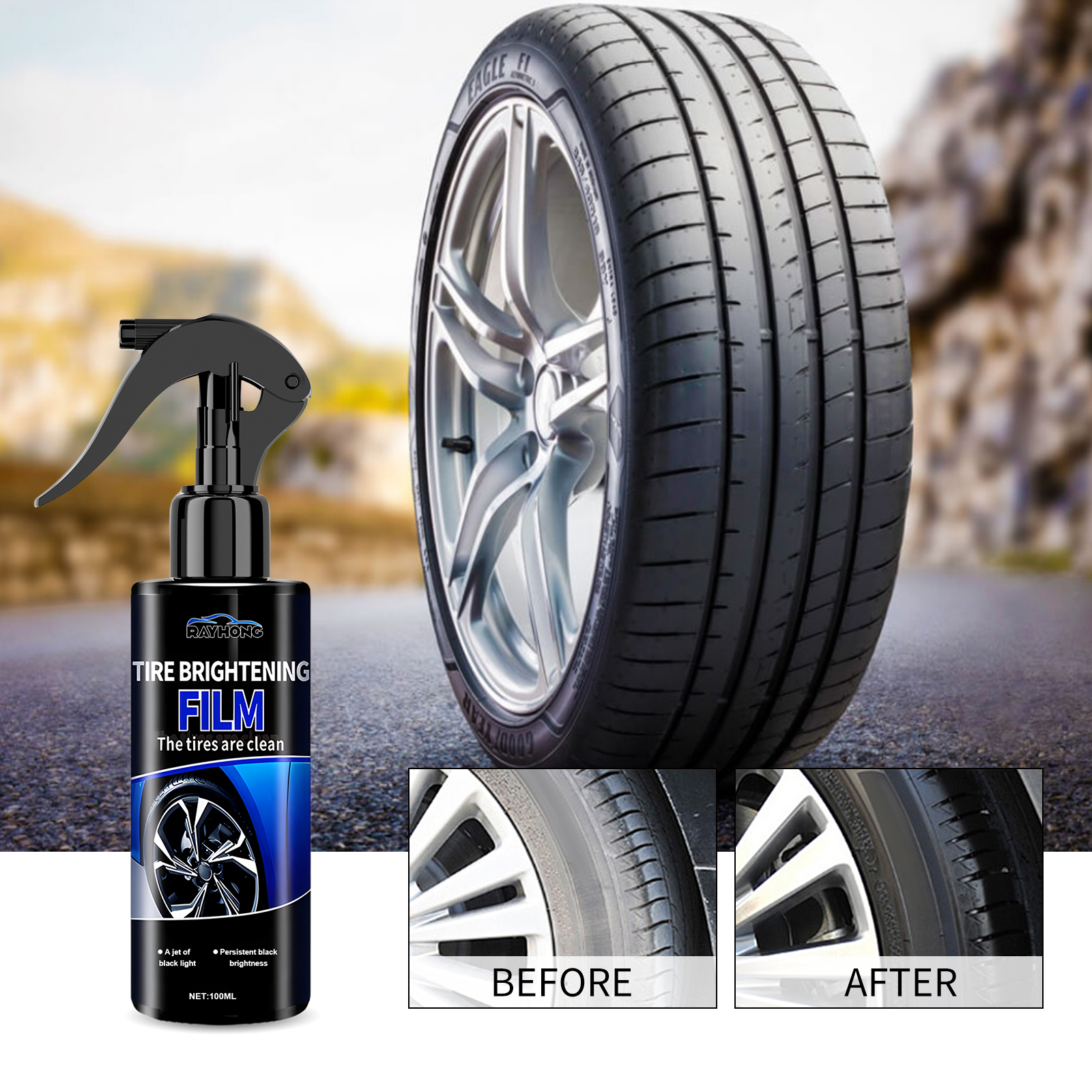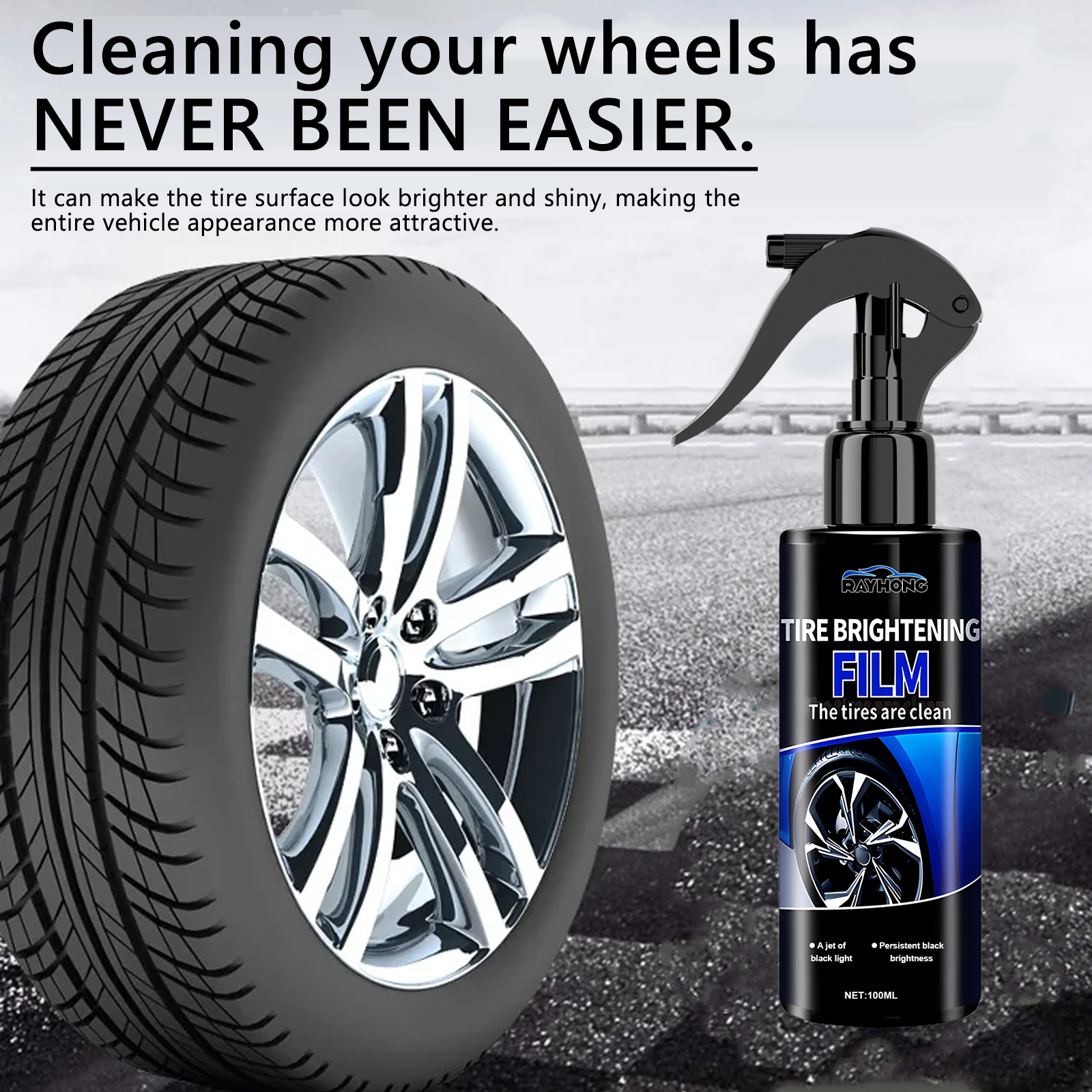 Our Tire Brightening Film contains deionized water, polyurethane emulsion, silicone oil. It can provide coating protection for tires, reducing the adhesion of dust, dirt, asphalt and other road pollutants to tires and reducing tire wear. Its use method is very simple: clean and dry the dust on the surface of the tire, shake the product and spray on the surface of the tire, rub it back and forth with a cloth, and let it dry naturally. Can make the tire surface look brighter and shiny, making the overall vehicle appearance more attractive.
