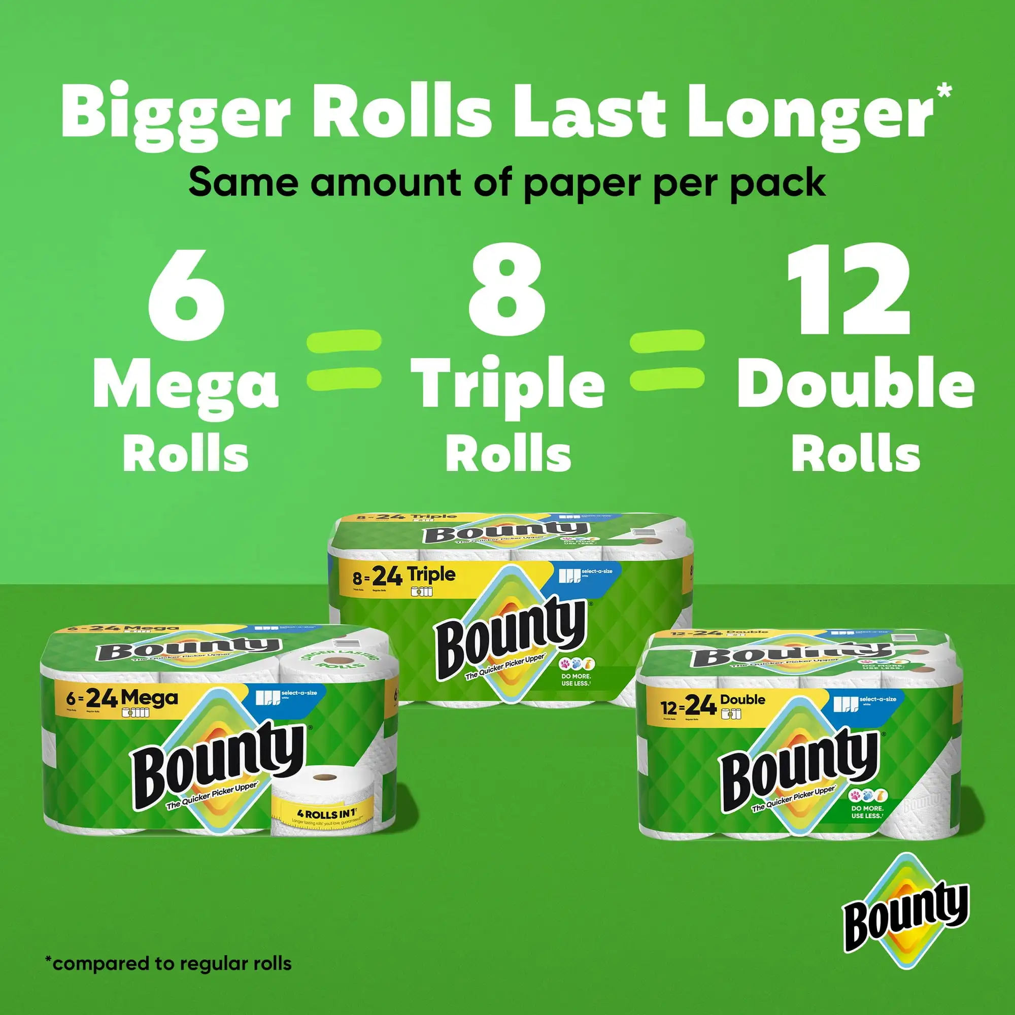 About this item Pack contains 6 Mega Rolls of white Bounty Select-A-Size Paper Towels 6 Mega Rolls = 24 Regular Rolls Select-A-Size sheets help you customize how much to use for each task Picks up spills and messes quicker vs. leading ordinary brand More absorbent so you can use less vs. leading ordinary brand Can tackle everyday messes and tough projects The Quicker Picker Upper* *vs. leading ordinary brand Most Awarded Paper Towel based on online media awards for the past 8 years
