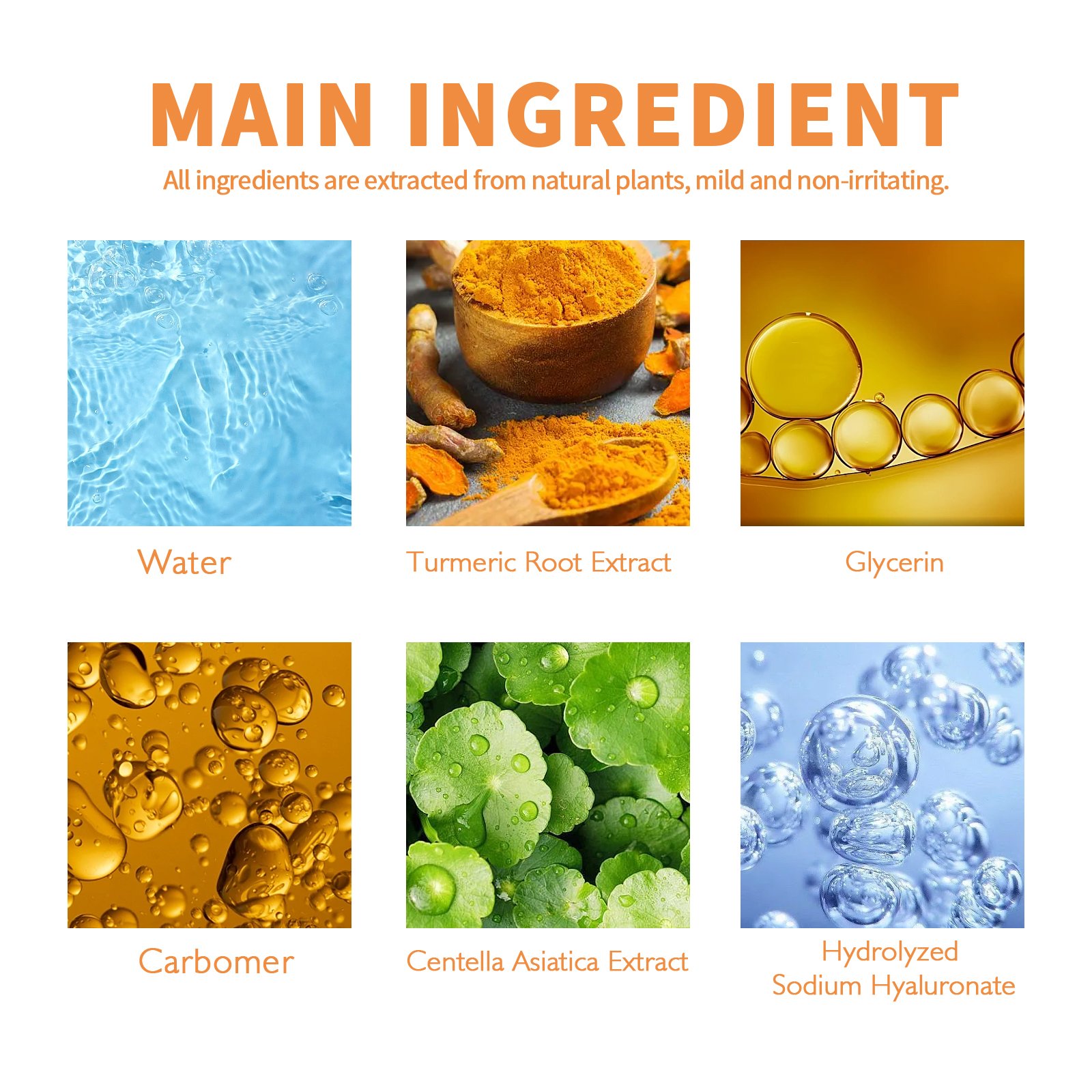 Our turmeric facial essence contains water, turmeric root extract, glycerin. It can deeply replenish water, and fade acne marks. The usage method is very simple. After cleansing and toning, take an appropriate amount of this product and evenly apply it to the face. Gently massage with your fingertips until absorbed. Deep moisturizing, brighten skin tone, lighten acne marks.